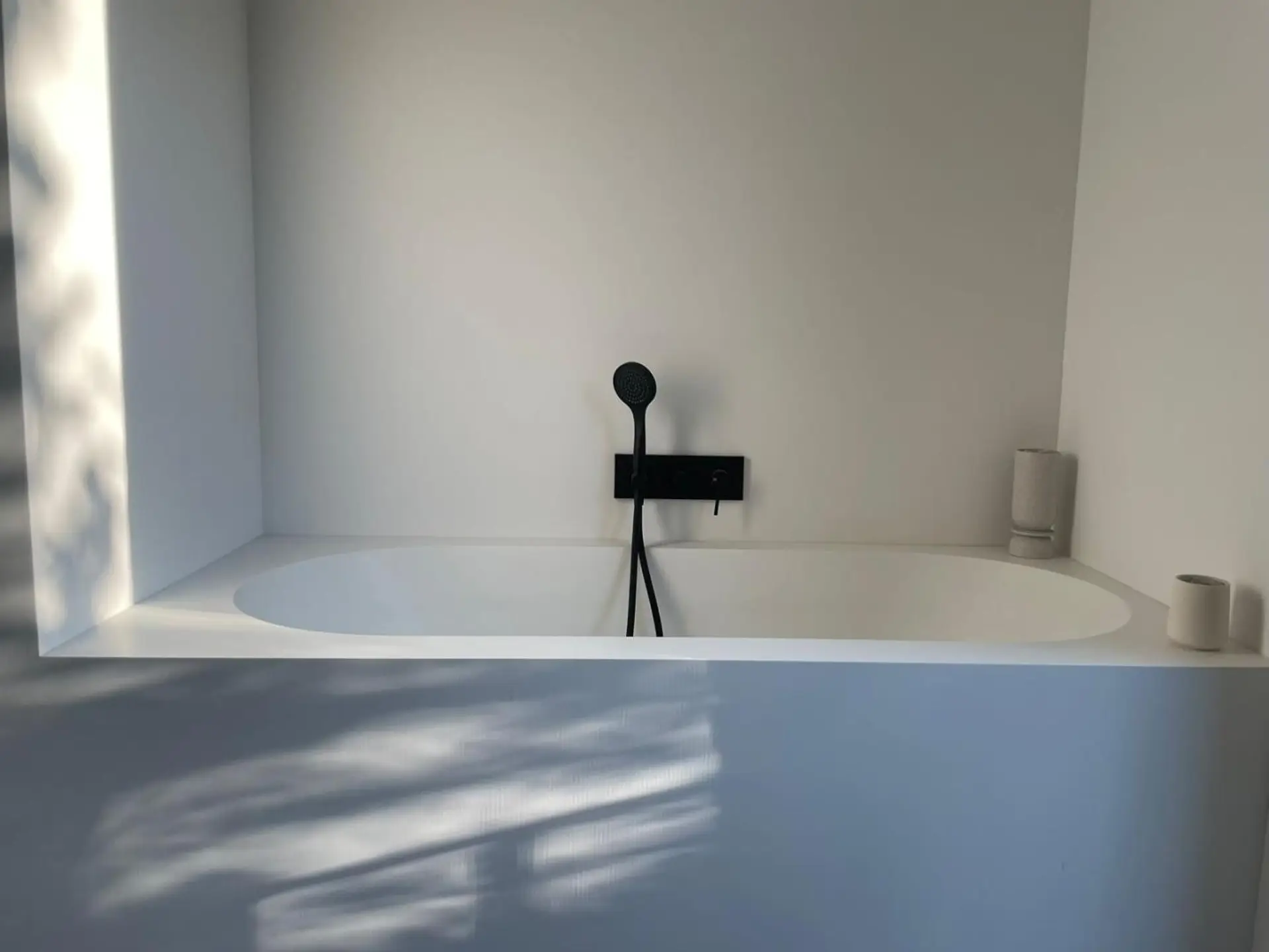 hochwertige Badezimmerausstattung: Waschtische, Waschbecken, Badewanne inkl. Wandverkleidung (nahtlos) aus Corian, Armaturen Schwarz matt, Gessi WCs weiß matt