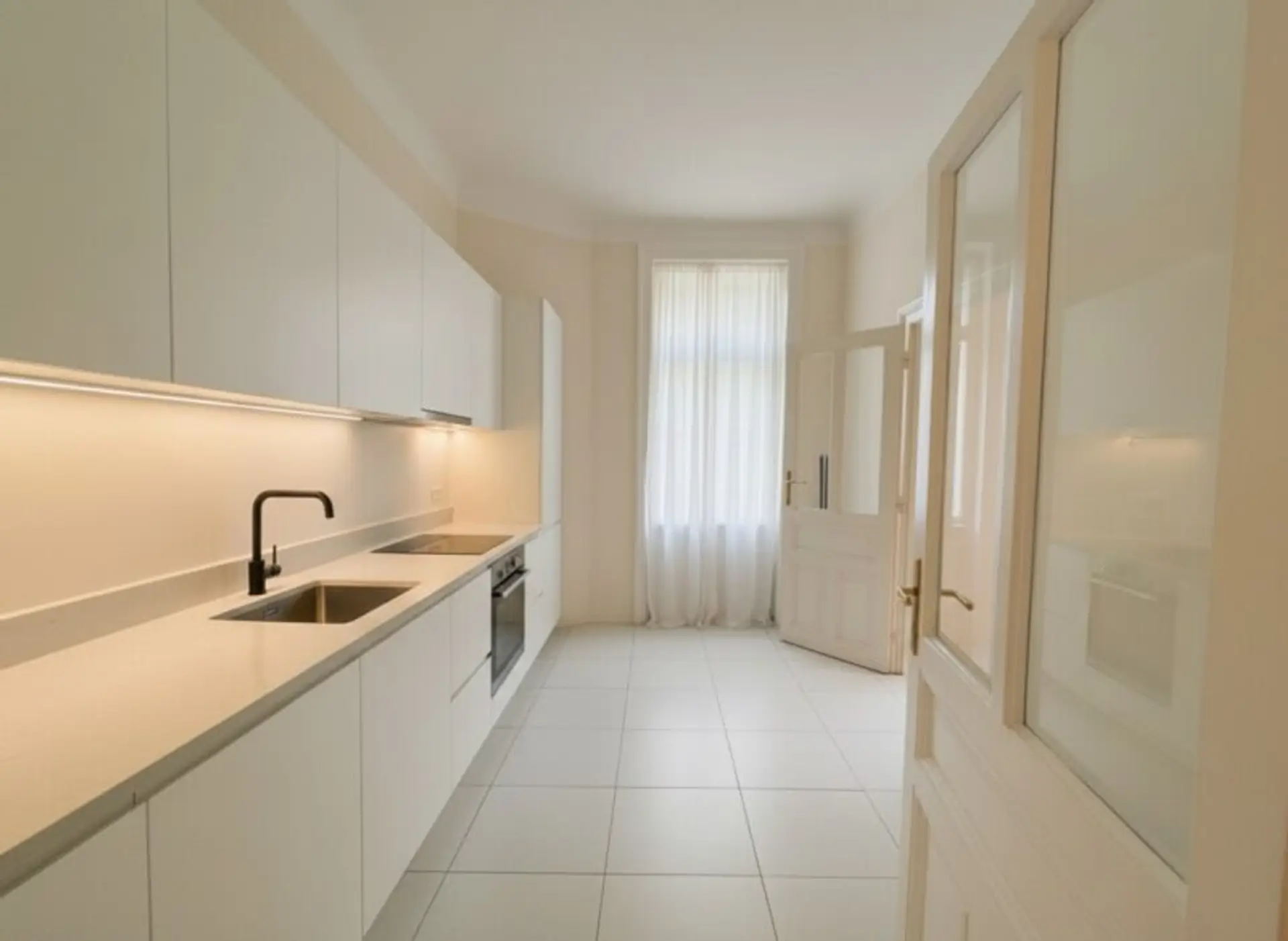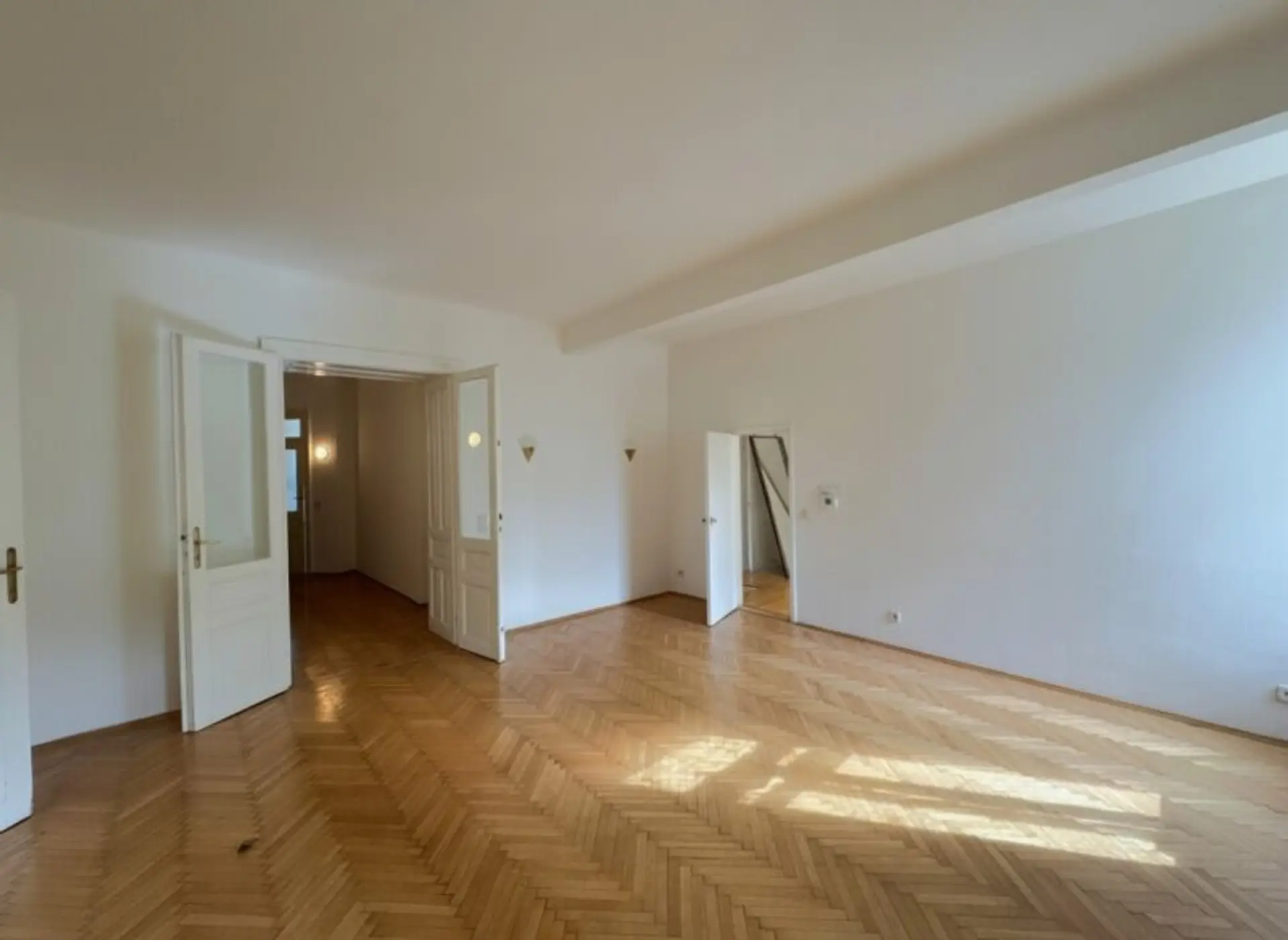 Die Wohnung liegt im Hochparterre des Hauses und heißt Sie mit einem großzügigen Vorraum willkommen. Geradeaus gelangt man in das Wohnzimmer mit Zugang zum ostseitigen Balkon. Auf diesem können Sie den Sonnenuntergang bei einem Aperitif genießen. Ausgehend vom Wohnzimmer können die beiden weiteren Zimmer jeweils über die originalen Doppelflügeltüren begangen werden. In der ganzen Wohnung ist ebenfalls der originale Fischgrätparkett erhalten geblieben. Ein weiteres kleines Zimmer befindet sich neben der Küche. Das Badezimmer verfügt über ein nordseitiges Fenster und eine Badewanne.