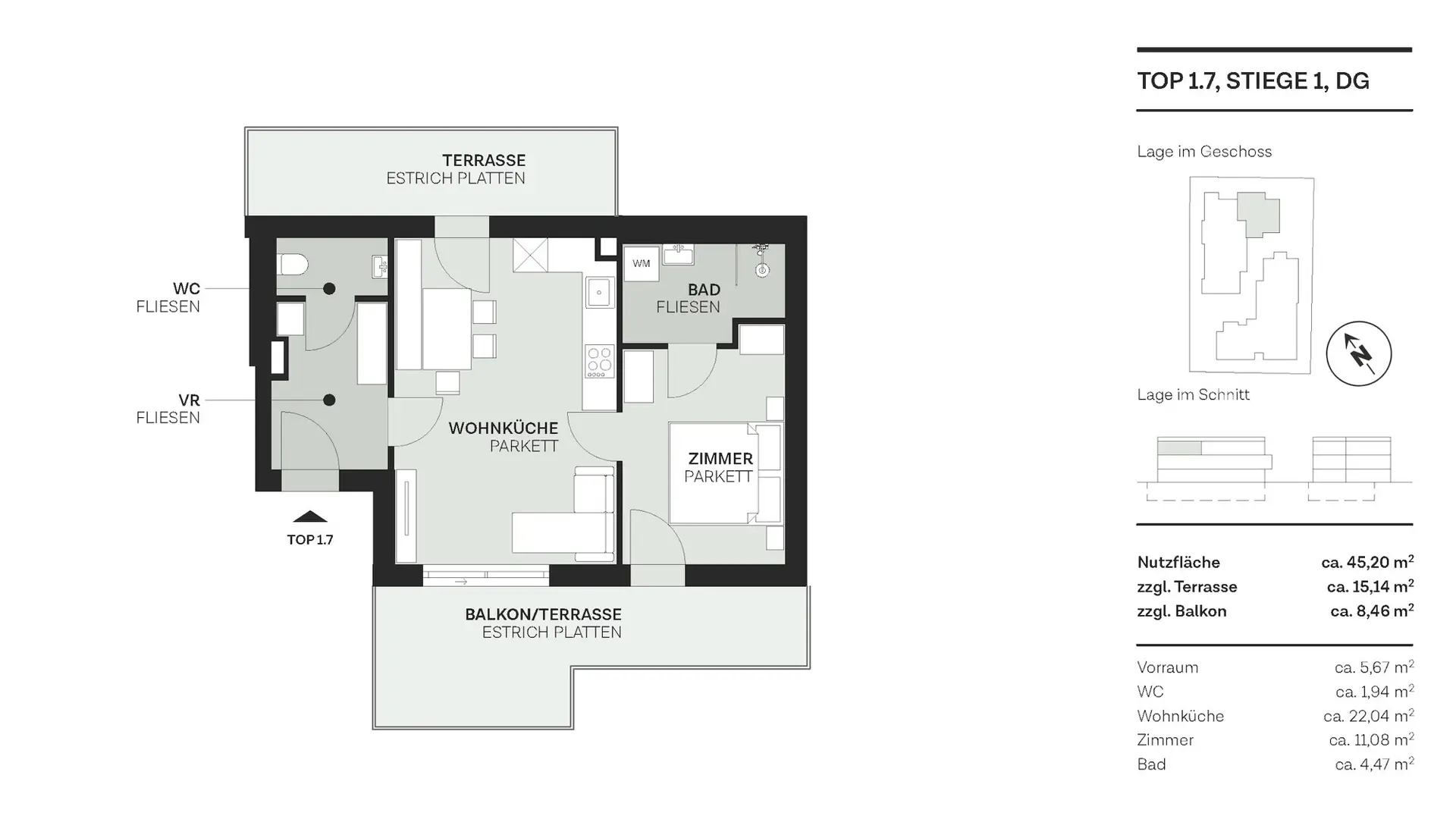 Diese exklusive 2-Zimmer-Dachgeschosswohnung bietet auf ca. 45 m² ein außergewöhnliches Wohnerlebnis mit insgesamt ca. 24 m² privaten Freiflächen. Die Aufteilung auf zwei Terrassen und einen Balkon sorgt für maximale Lichtdurchflutung und vielfältige Nutzungsmöglichkeiten im Außenbereich. Mit modernster Haustechnik, einer eigenen Liftruftaste in der Wohnung und dem Premium-Interieur ist dieses Apartment ein wahres Juwel für urbane Individualisten.