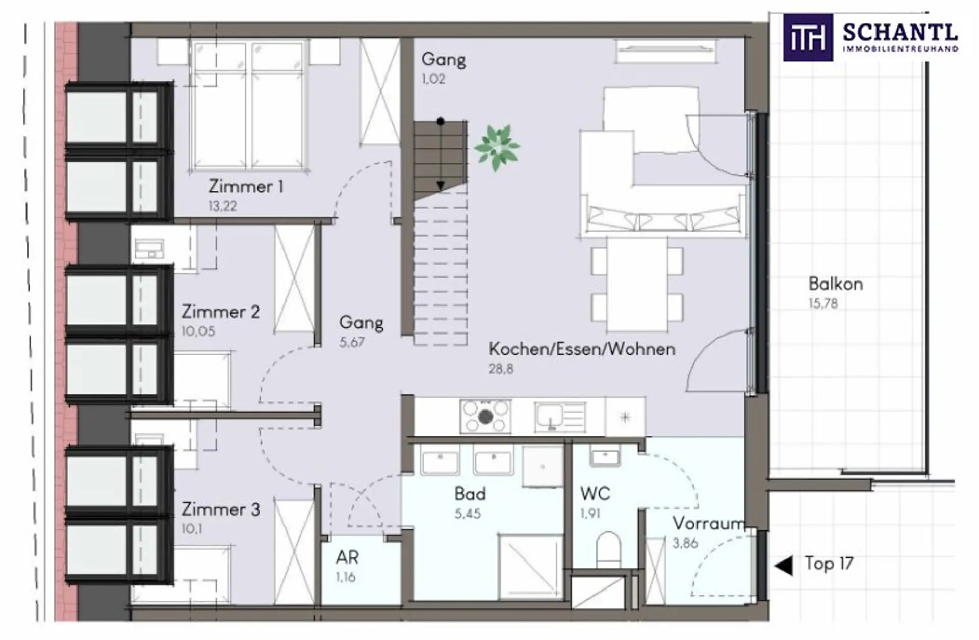 Wohnfläche: ca. 81,25 m² + Dachraum: ca. 17,59 m² + Terrasse: ca. 15,87 m² + Dachterrasse: ca. 35,20 m² + Kellerabteil