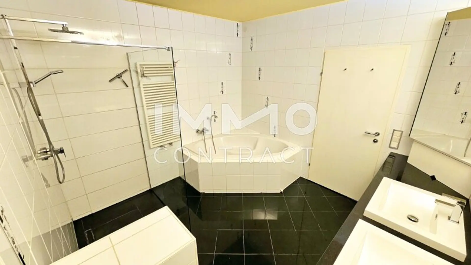 Das exklusive Badezimmer wird Sie begeistern: Walk-In Regendusche, Badewanne, Doppelwaschtisch, Spiegelschrank, WC, hochwertige Armaturen, edler Granitboden – ein Ort der Entspannung und Ruhe.