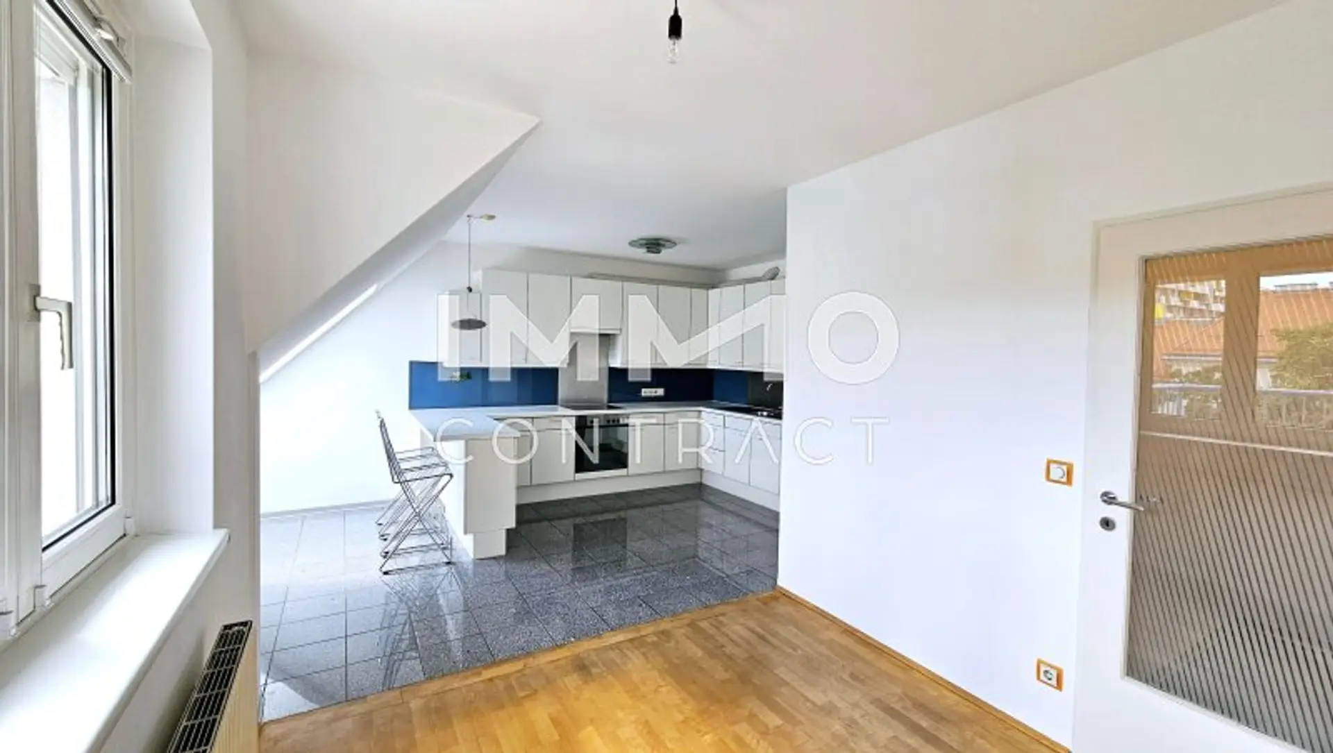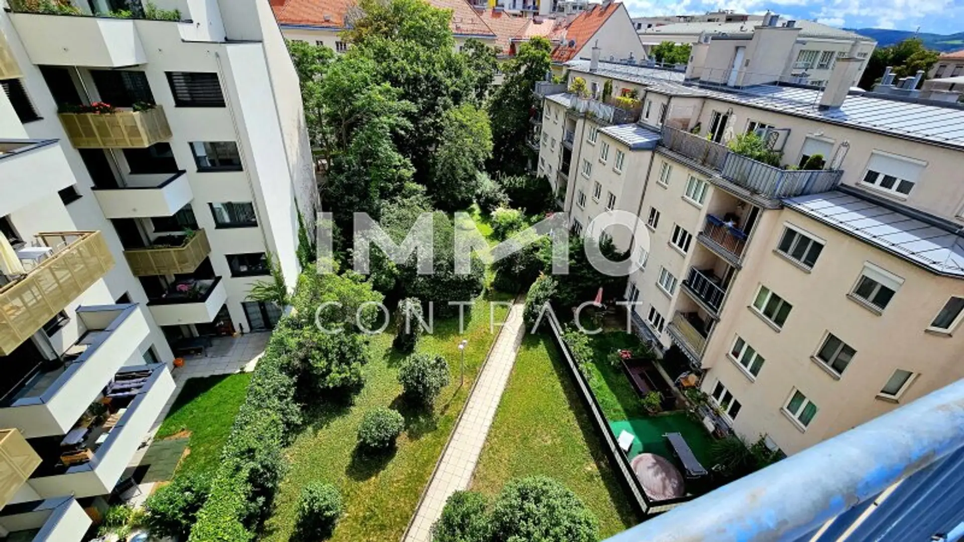 Vom Wohn-Essbereich haben Sie Zutritt zur 16m² großen, nach Südwesten ausgerichteten, Terrasse mit Blick in den grünen Innenhof und über die Dächer von Wien.