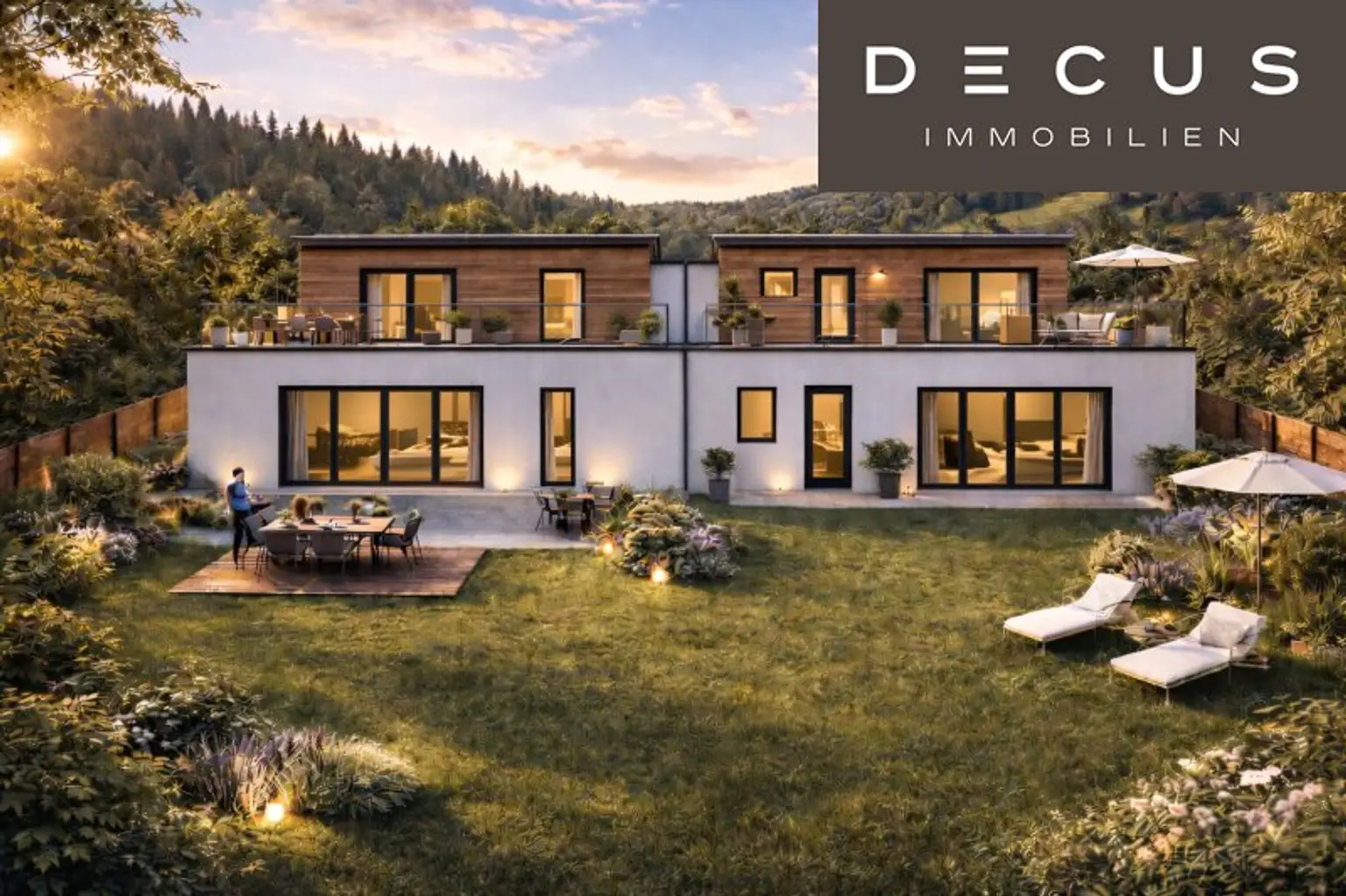 Das hintere Doppelhaus grenzt direkt an den Wienerwald. Kein gegenüberliegender Nachbar, keine zukünftige Verbauung – nur Natur. Diese seltene Kombination aus Seeblick, erhöhter Lage und unmittelbarem Waldanschluss verleiht dem Projekt eine außergewöhnliche Exklusivität.