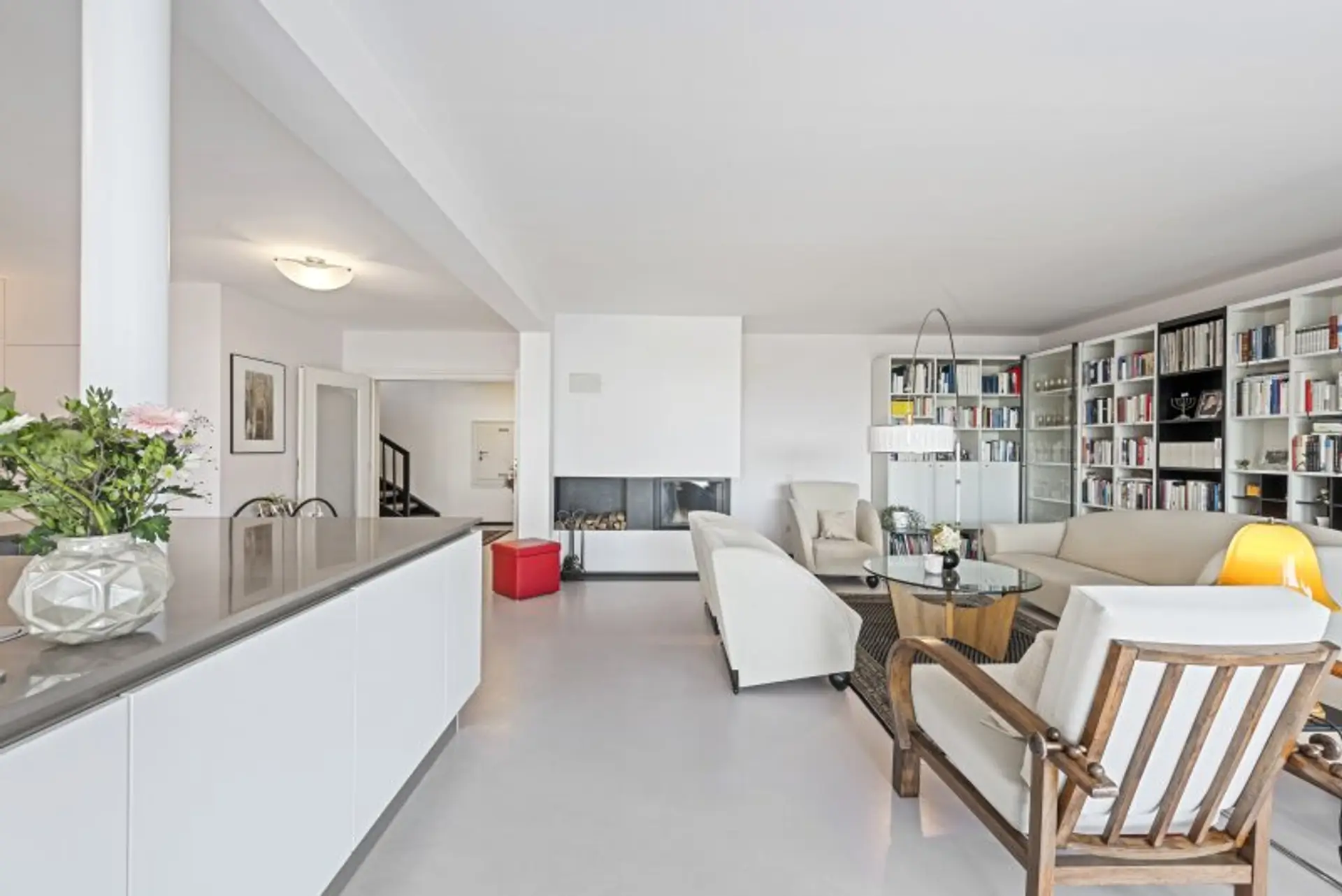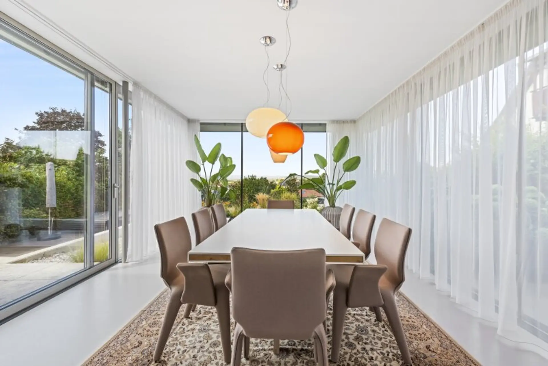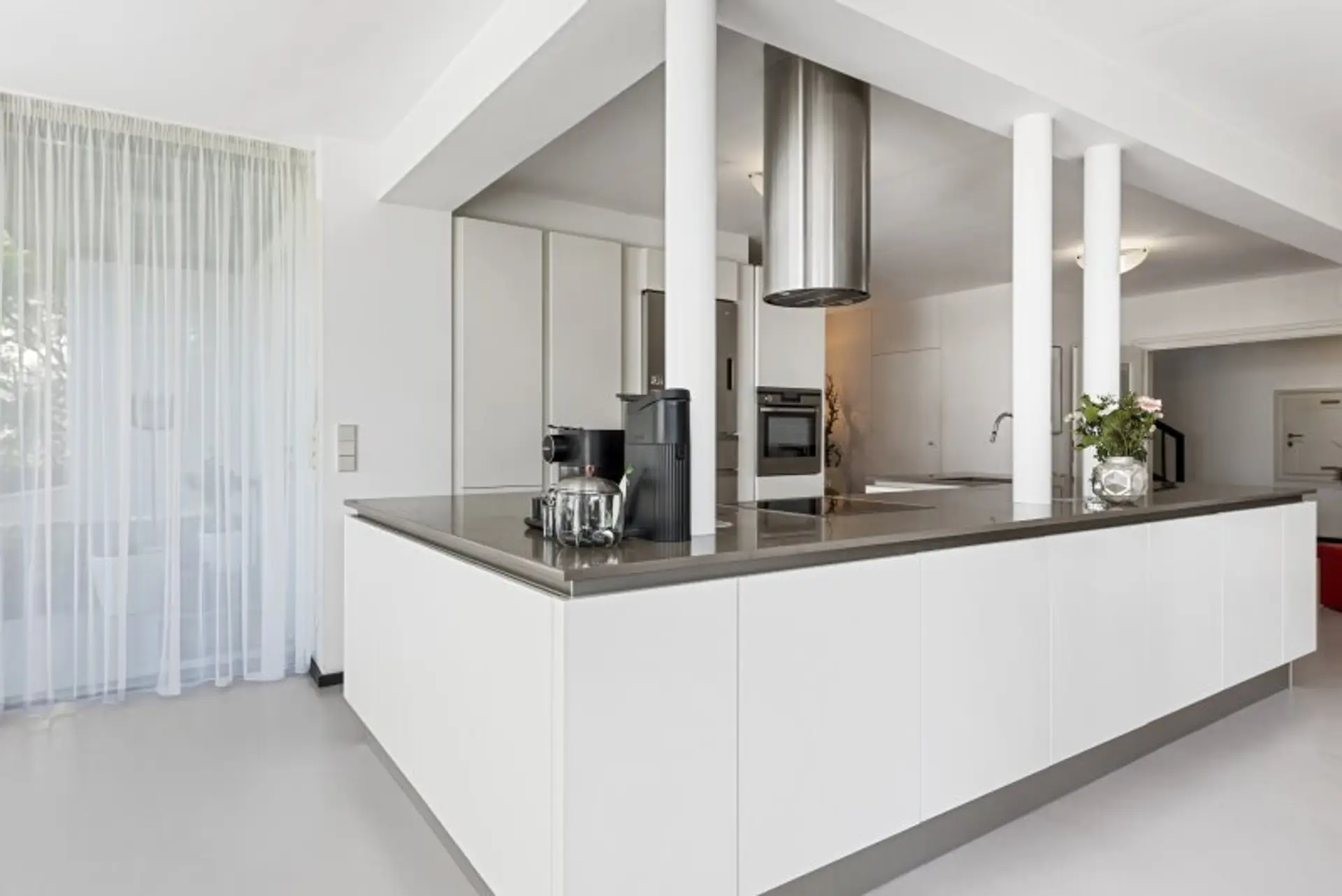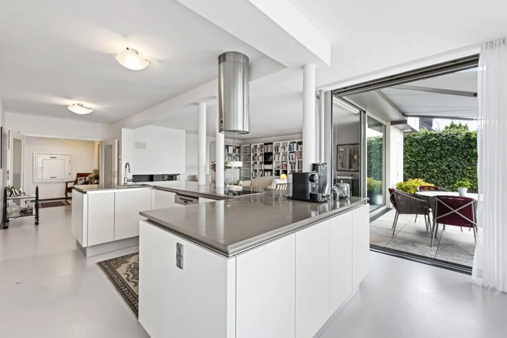 Das Herzstück des Hauses ist die hochwertig ausgestattete, offene Designerküche, die mit allen Geräten ausgestattet ist und zum entspannten Miteinander einlädt. Für gemütliche Stunden sorgt der stilvolle offene Kamin, dessen Flammenschein sich in den Glasfronten widerspiegelt und eine behagliche Atmosphäre schafft.