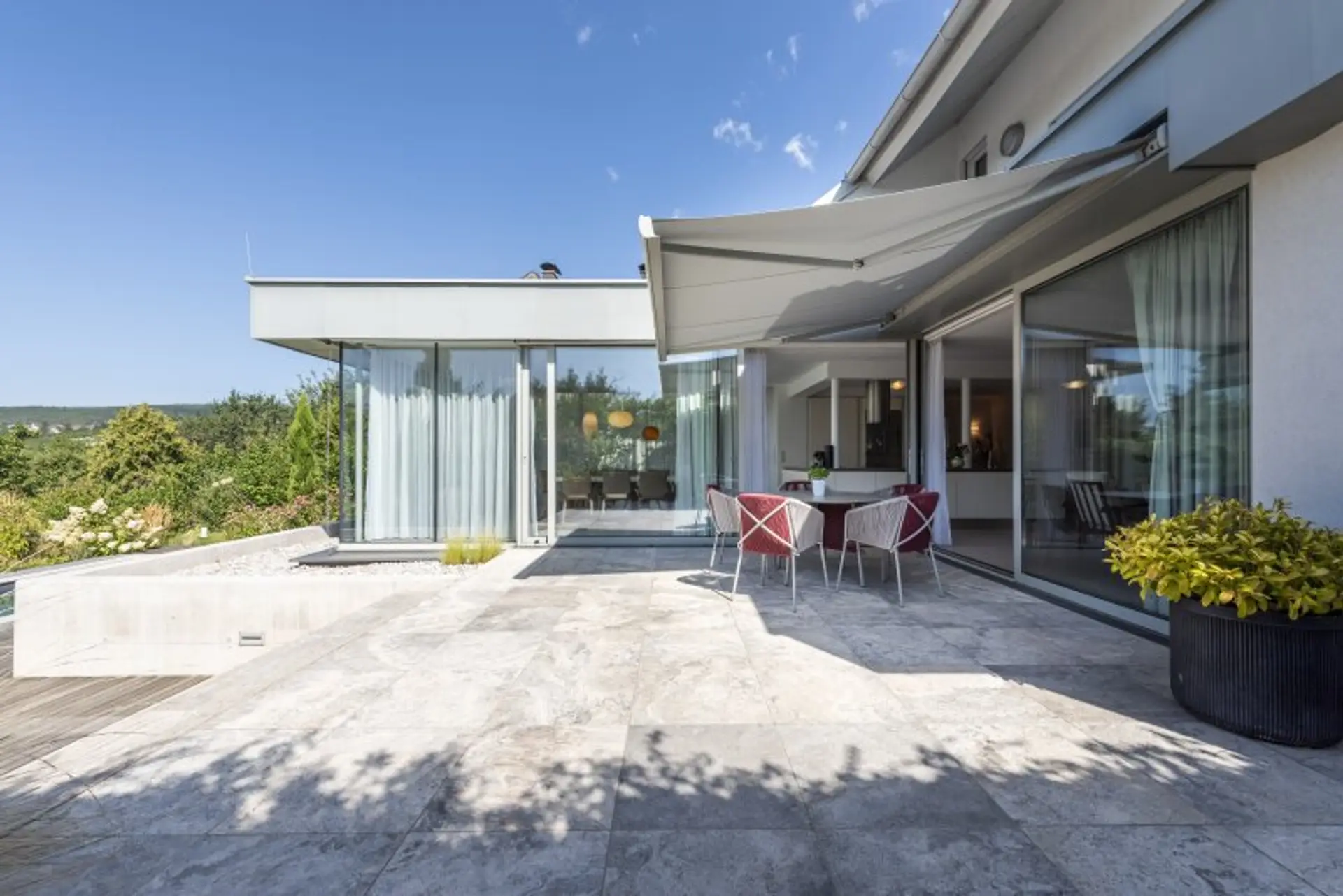 Die 34 m² große Terrasse mit elektrischer Markise lädt zu entspannten Stunden im Freien ein. Über wenige Stufen gelangt man zur Liegeterrasse und zum 8 x 2,5 Meter großen Pool, der mit einer praktischen Abdeckung ausgestattet ist.