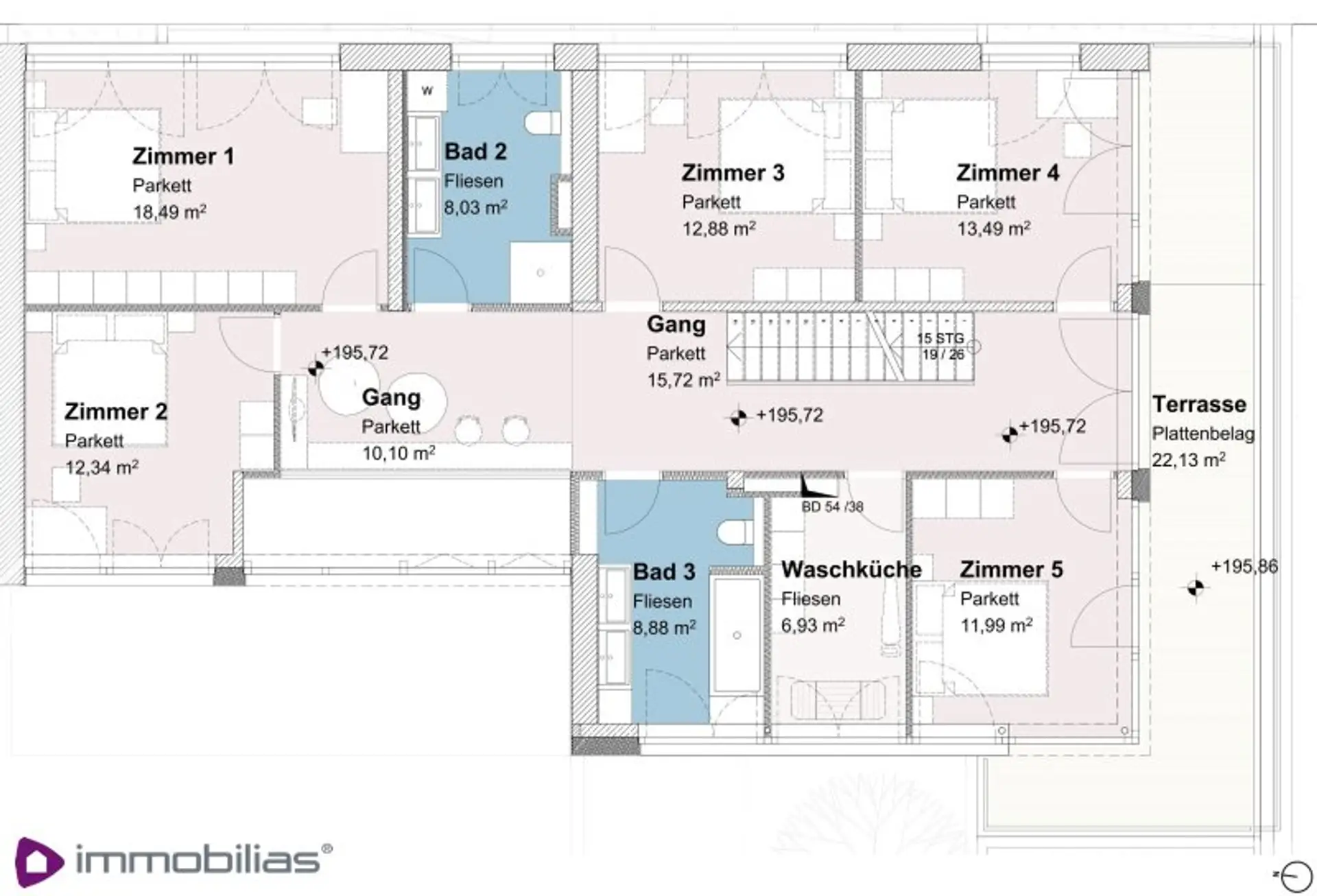 Südterrasse, ca 22,12 m², vom Gang sowie Schlafzimmer 4 und 5 aus zu betreten