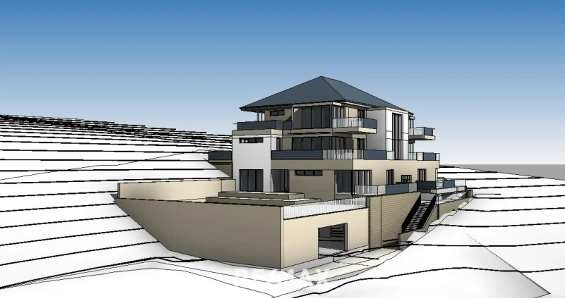 Baukörper: Moderner, terrassierter Entwurf mit großzügigen Glasfronten.