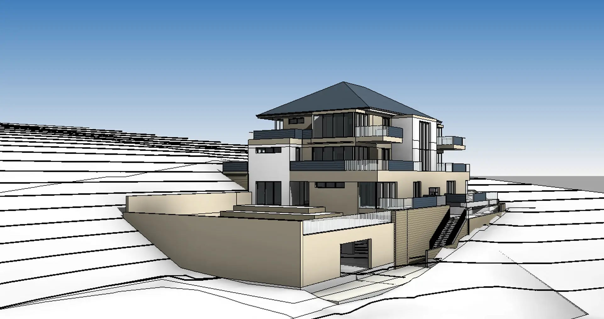 Dieses Angebot richtet sich gezielt an Investoren und Bauträger, die ein wertsteigerndes Projekt in einer Wachstumsregion suchen. Die vorhandene Planung nutzt die Hanglage des Grundstücks optimal aus: