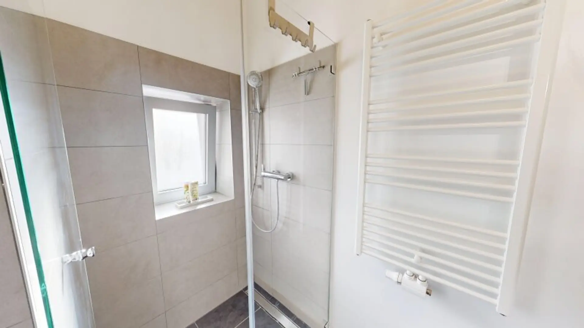 Barrierefreie Dusche mit Fenster und Handtuchwärmer