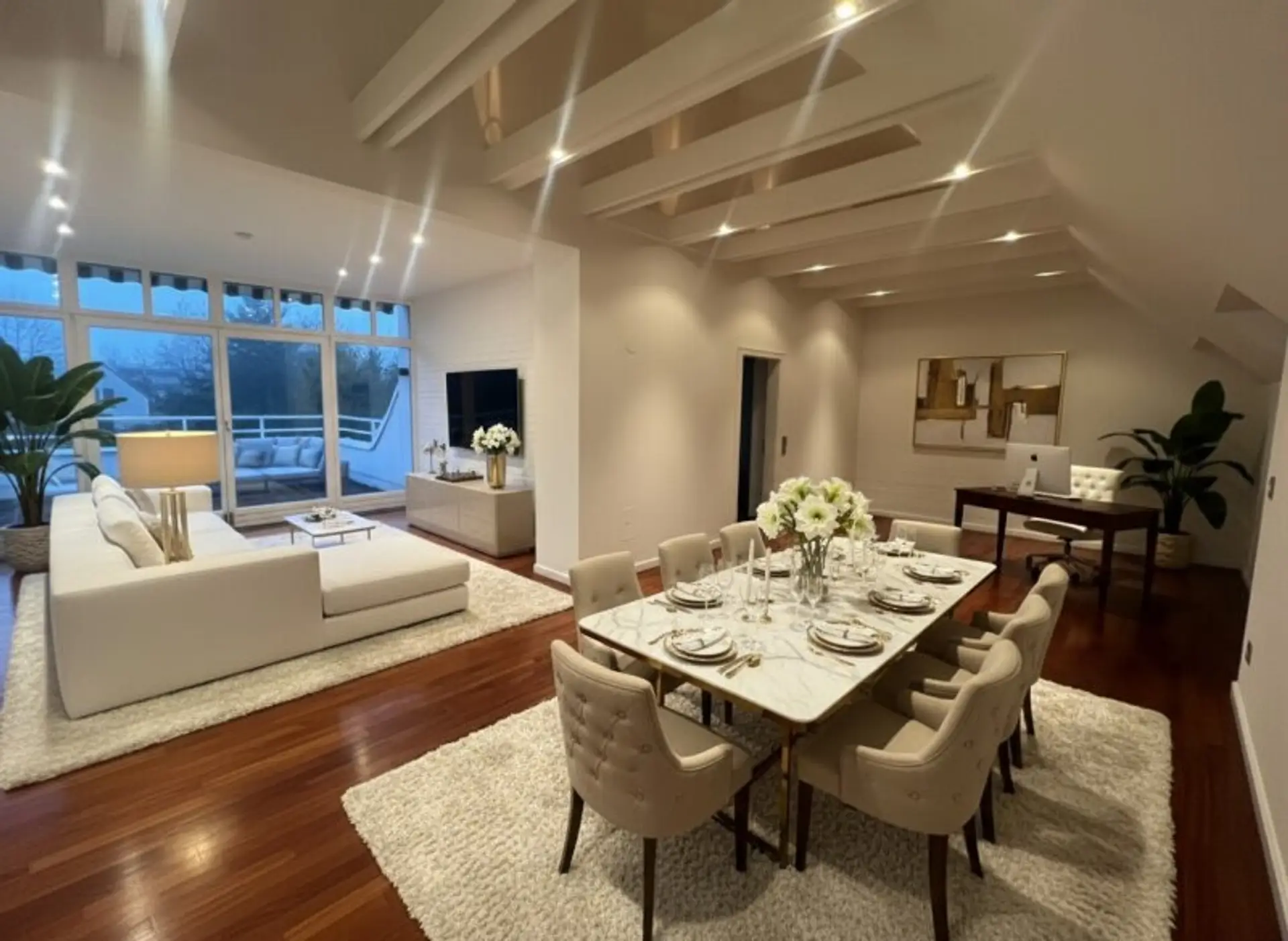 Der großzügige Wohn- und Essbereich bietet vielfältige Gestaltungsmöglichkeiten und geht harmonisch in eine moderne, hochwertig ausgestattete Küche über – ideal für Designliebhaber und alle, die Wert auf exklusives Wohnen legen.
