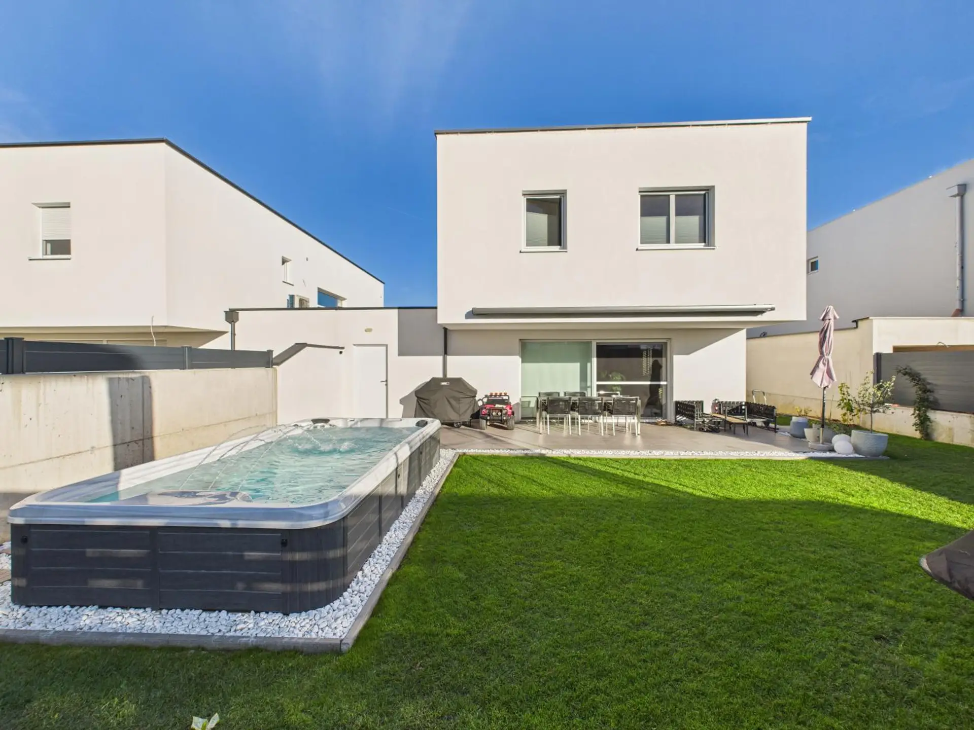Der traumhaft gestaltete Außenbereich ist eine Oase für Genießer. Die großzügige Terrasse mit elektrischer Markise lädt zum Verweilen ein, während der top gepflegte Garten mit seinem Herzstück begeistert: ein hochwertiger Swim-Spa von Beta Wellness – Kombination aus Whirlpool und Gegenstromanlage. Perfekt für Sport, Wellness und Erholung direkt zu Hause.