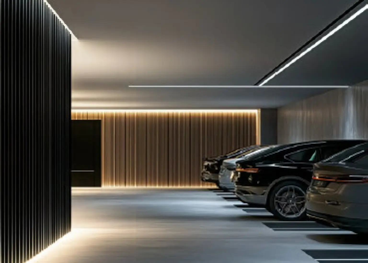 A private elevator connects every level — from the rooftop terrace down to the garage parking spaces.
