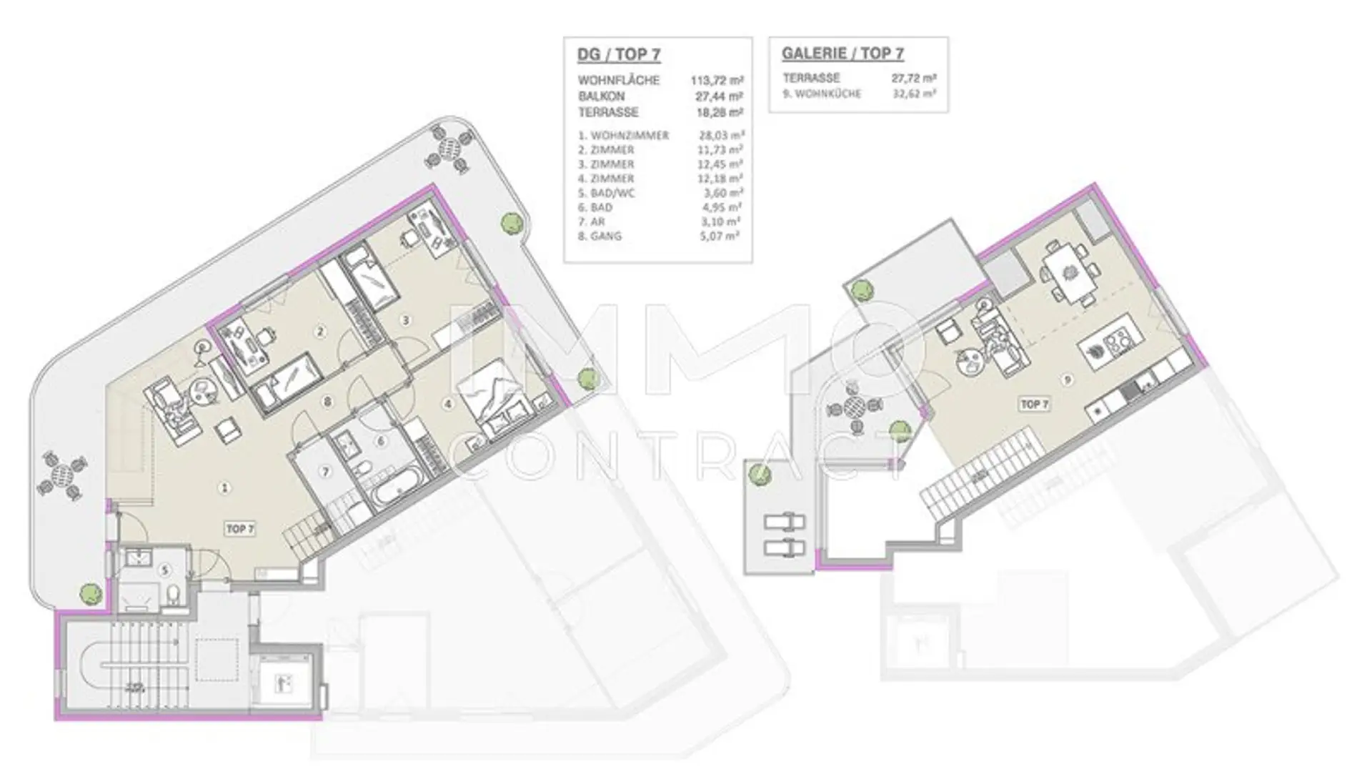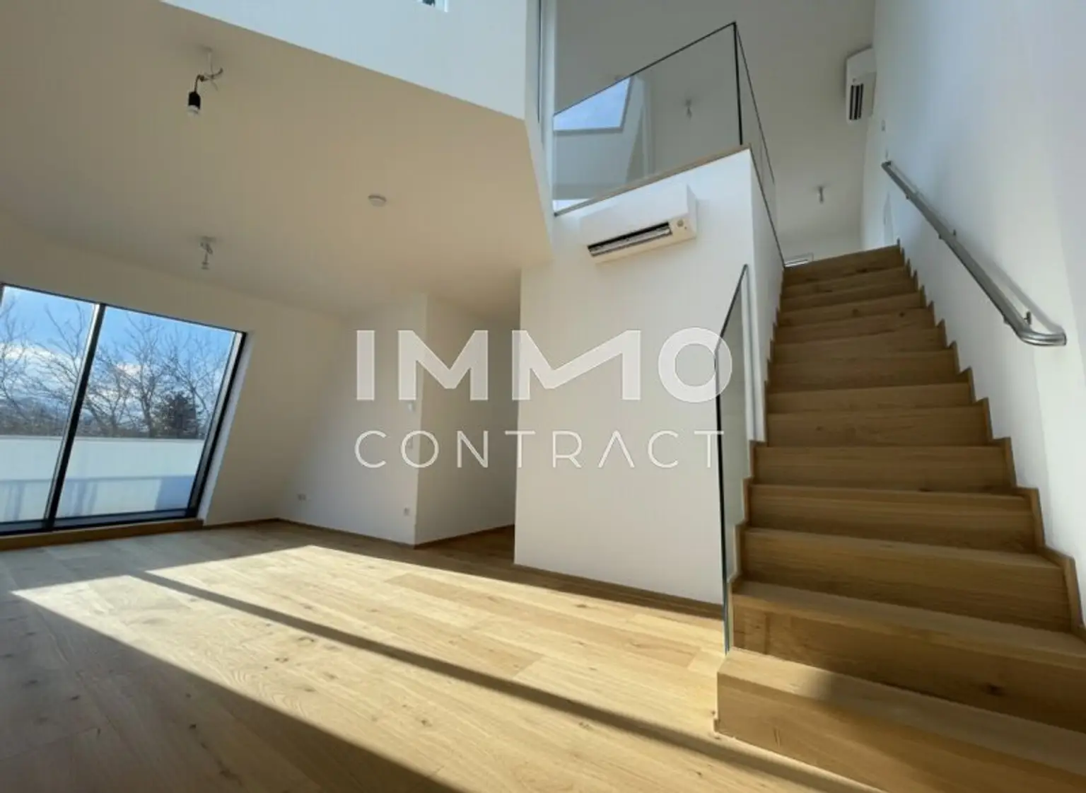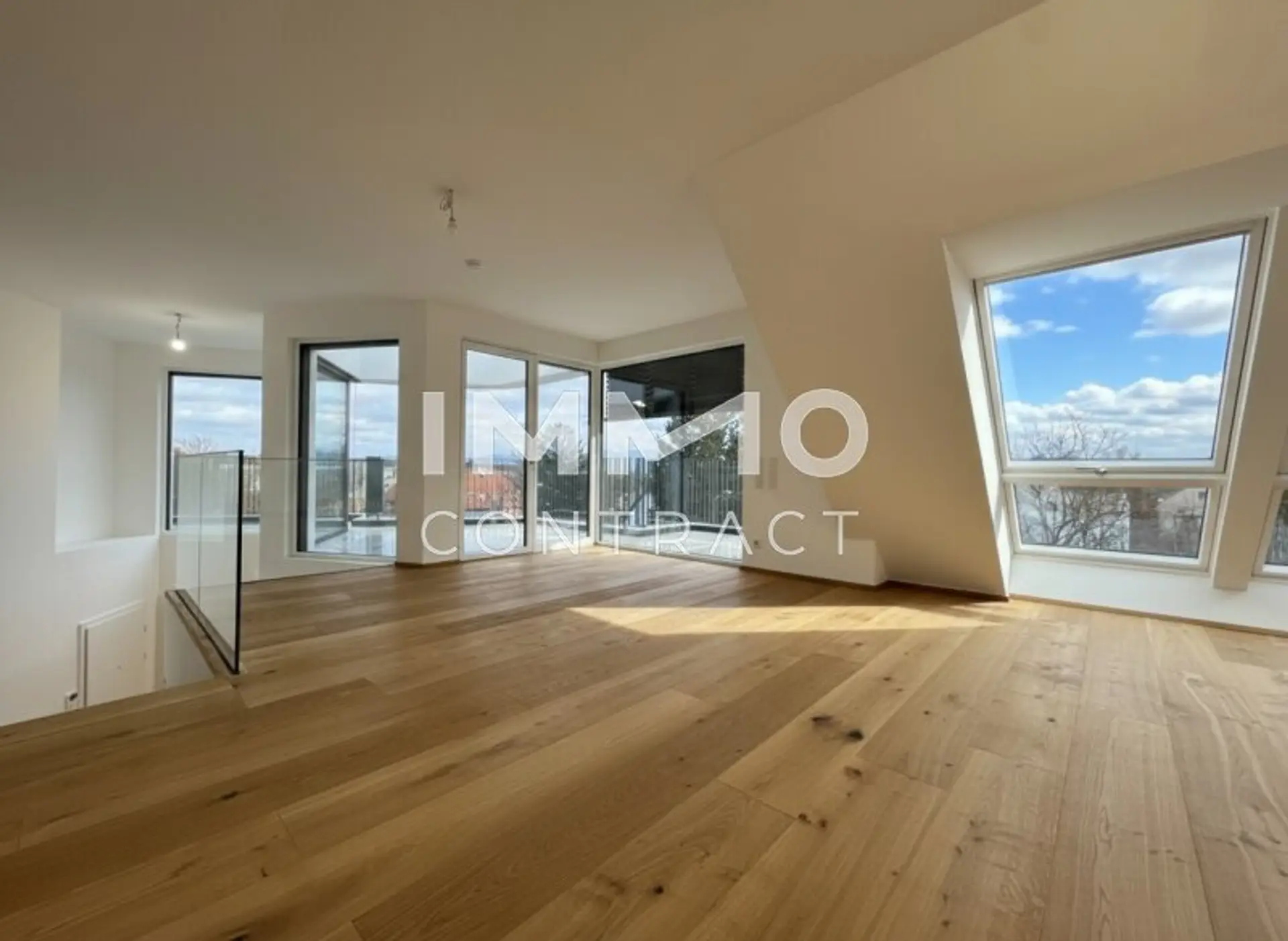 Top 7 begeistert mit lichtdurchfluteten Räumen und großzügigen Glasflächen. Das offene Konzept mit bis zu knapp 6 m Raumhöhe und weitläufigen Außenbereichen sorgt für ein höchst beeindruckendes Wohngefühl. Das außergewöhnliche Penthouse bietet auf rund 114 m² Wohnfläche verteilt auf zwei Ebenen viel Platz für exklusive Wohnträume – perfekt für alle, die etwas ganz Besonderes suchen. Die drei Schlafräume eröffnen vielfältige Nutzungsmöglichkeiten: Arbeiten im eigenen Homeoffice, ein separates Fitness- oder Yogazimmer oder ein komfortabler Gästebereich. Zwei Badezimmer – eines mit Badewanne und WC, das andere mit Dusche, WC und Fenster mit Grünblick – sorgen für zusätzlichen Komfort. Die beiden weitläufigen Terrassen ergänzen das Wohnerlebnis: Die untere Terrasse mit ca. 45 m² Außenfläche eignet sich ideal als ruhiger Sonnenplatz mit charmanter Bepflanzung, während die obere Terrasse mit ca. 28 m² perfekt für entspannte Abende mit Freunden als Outdoor-Wohnzimmer oder privater Sonnenbereich genutzt werden kann.