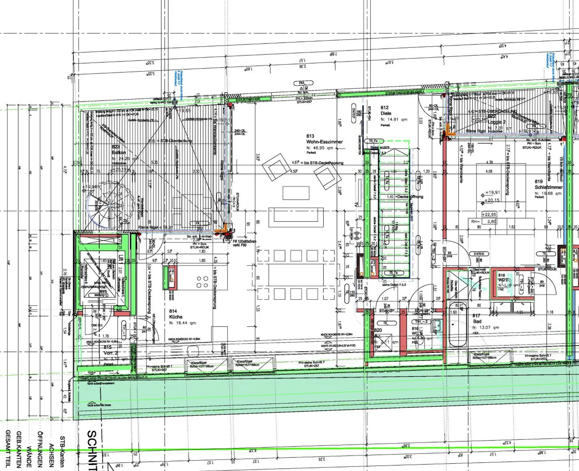 -ein repräsentativer, lichtdurchfluteter Wohn-Essbereich mit offener Küche mit fast 60m2 und Ausgang auf den fast 25m2 großen Balkon, voll überdacht, süd-westseitig orientiert