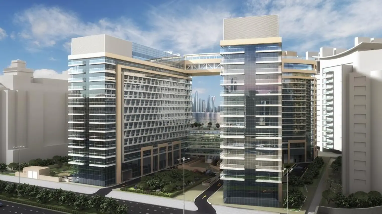 Die Anlage besteht aus zwei architektonisch eleganten Gebäuden, die durch eine spektakuläre schwebende Terrasse miteinander verbunden sind.