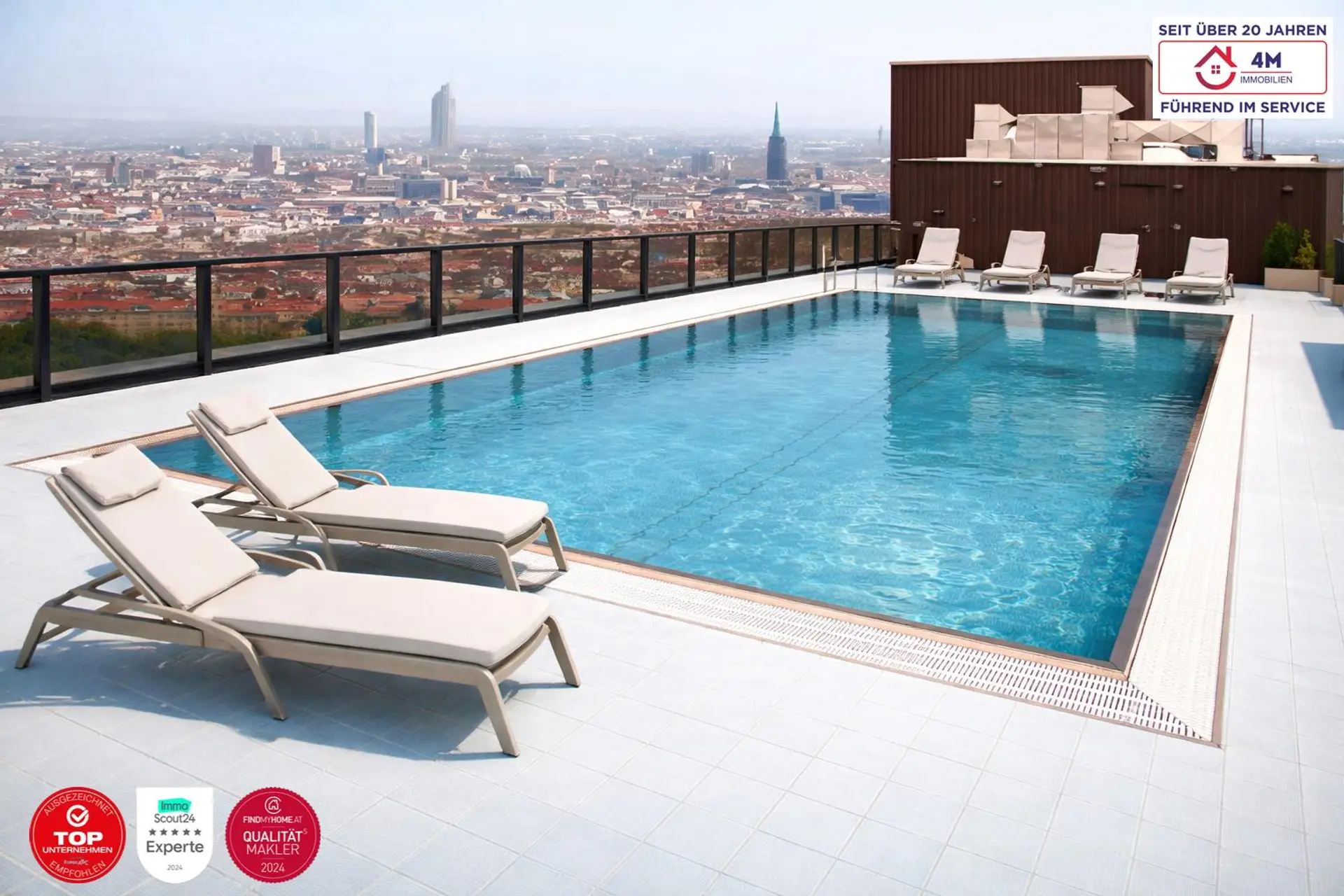 Ein besonderes Highlight ist das exklusive Zusatzangebot der Wohnanlage: Concierge-Service, Pool am Dach, Sauna, zwei Fitnessräume, Gemeinschaftsflächen sowie ein Tiefgaragenstellplatz. Abgerundet wird das Wohngefühl durch einen beeindruckenden Panoramablick über Wien.