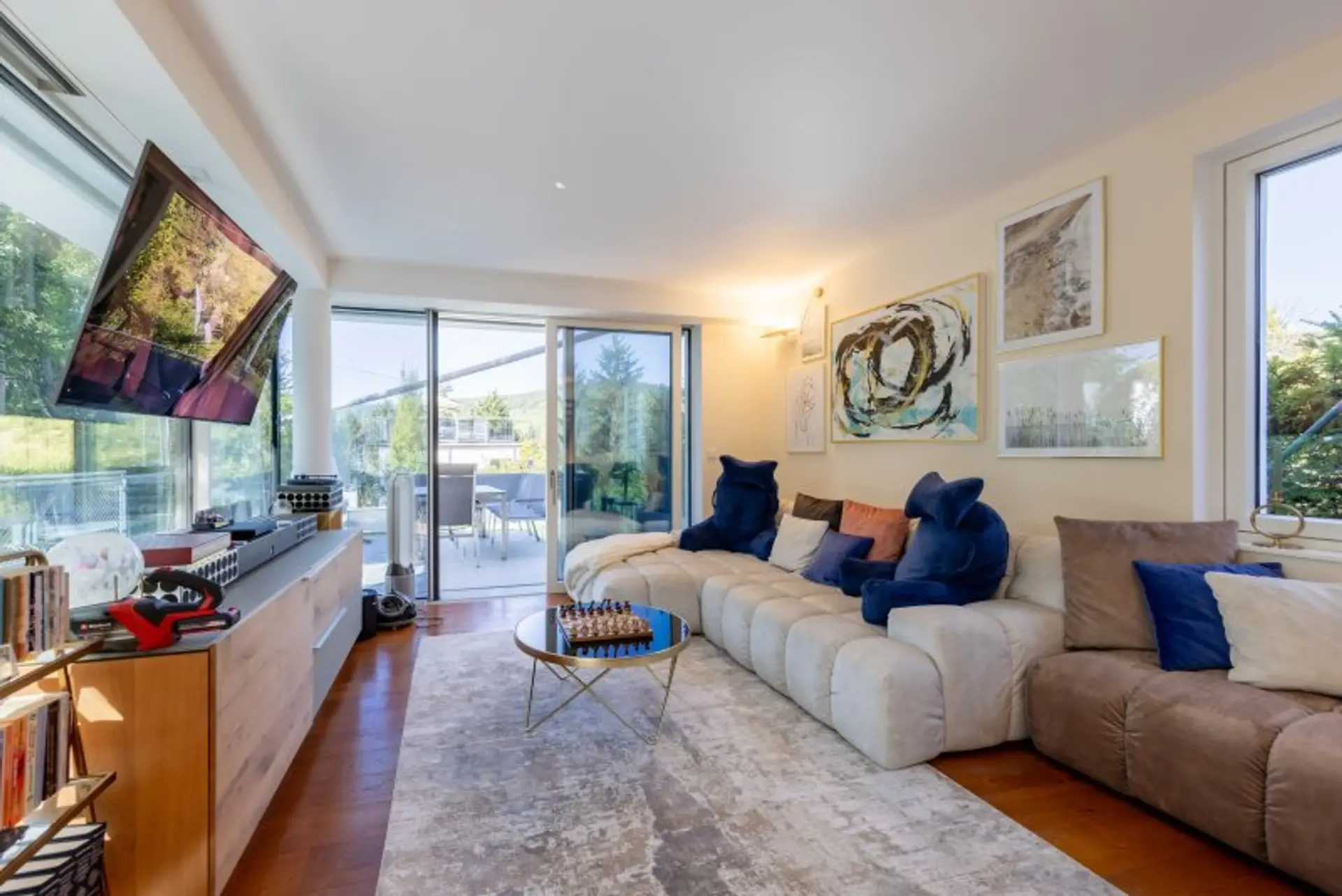 Die Immobilie ist mit einer energiesparenden Wärmepumpe und einer Solaranlage ausgestattet, die ein besonders ressourceneffizientes Wohnen ermöglichen. Pufferspeicher sorgen dafür, dass die Sonnenenergie optimal genutzt wird. Für höchsten Komfort sorgen Fußboden- und Deckenkühlung, die eine gleichmäßige und angenehme Verteilung von Wärme und Kälte in allen Räumen gewährleisten. Bodentiefe, dreifach verglaste Fenster sind mit elektrischen Raffstores ausgestattet und verbinden Ästhetik mit Funktionalität. Die durchdachte Ambientebeleuchtung im Innen- und Außenbereich rundet die exklusive Wohnatmosphäre ab. Der hochmoderne Pool überzeugt durch minimalistisches Design und zehn unterschiedliche Funktionen, während der Whirlpool Platz für vier Personen bietet und höchsten Entspannungswert garantiert. Alle Terrassenflächen sind mit hochwertigen Steinteppich ausgestattet. Das gesamte Haus mit maßgefertigten Tischlerschränken bietet großzügigen Stauraum bei klarer Linienführung.