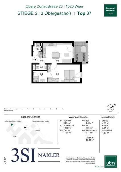 Diese moderne Wohnung befindet sich im 2. Obergeschoß. Die Einheit verfügt über eine Wohnnutzfläche von insgesamt 34,63 m² und bietet zusätzlich einen ca.6,26 m² großen Balkon.