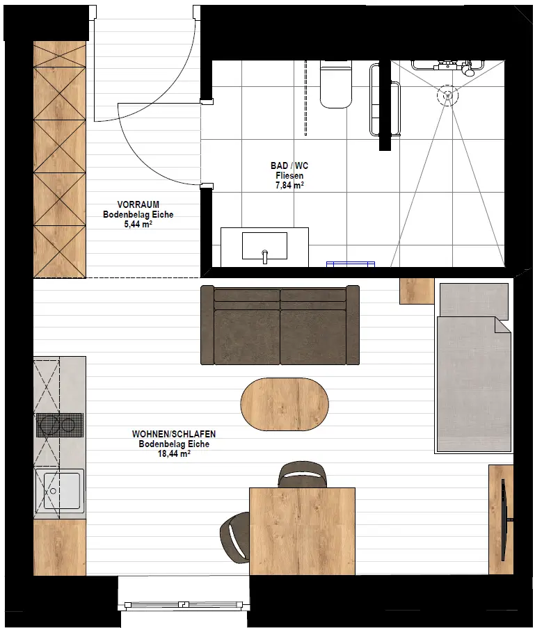 Diese moderne Einzimmerwohnung überzeugt durch Wohn-, Schlaf- und Kochbereich mit voll ausgestatteter Küchenzeile, der ein angenehmes und offenes Wohngefühl schafft. Das komfortable Badezimmer bietet ausreichend Platz und hohen Komfort.