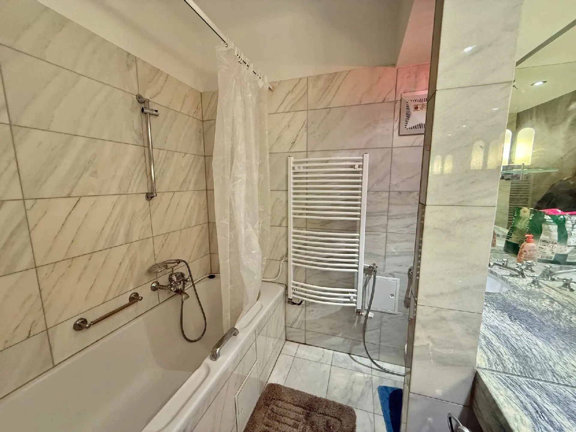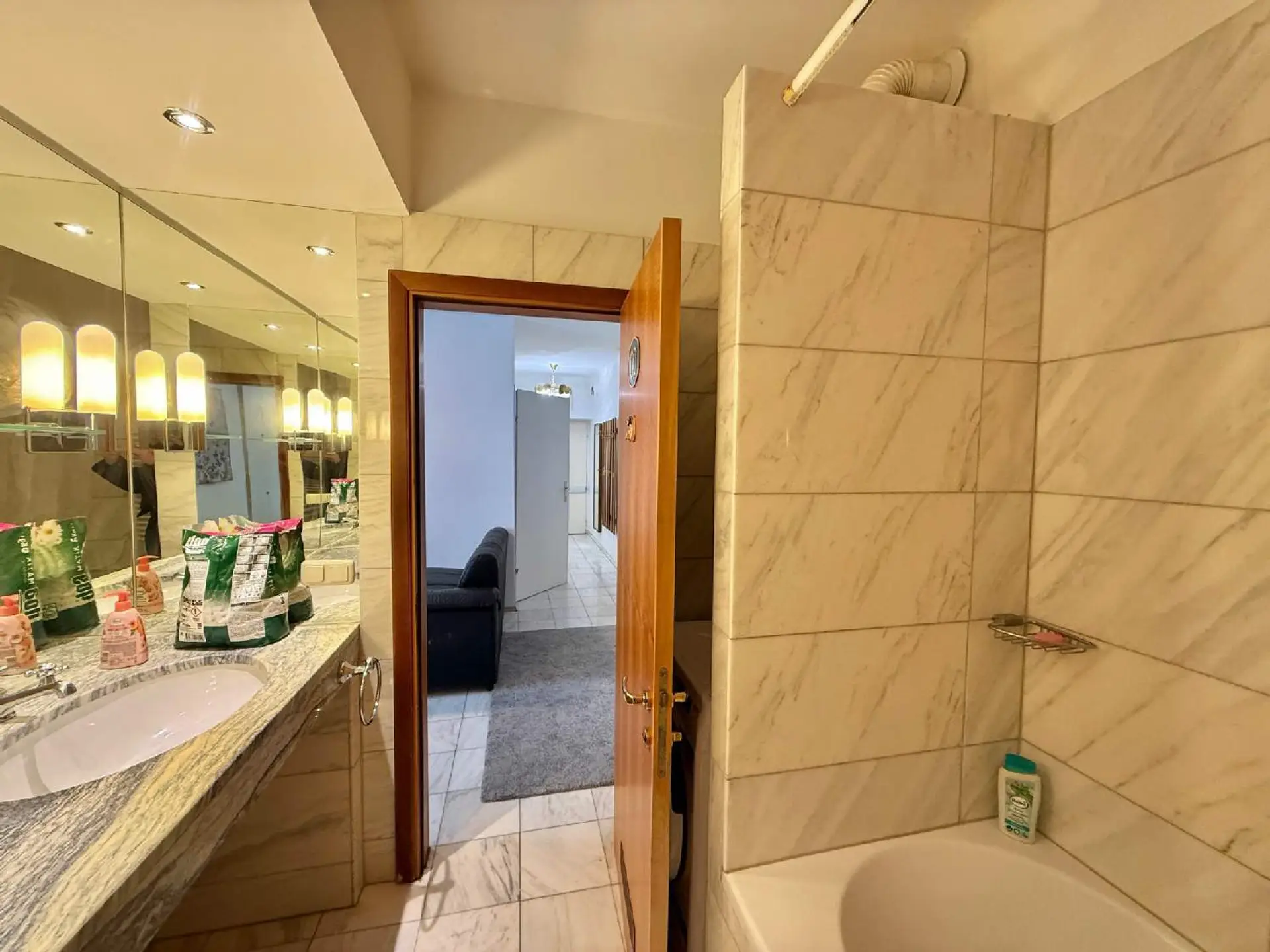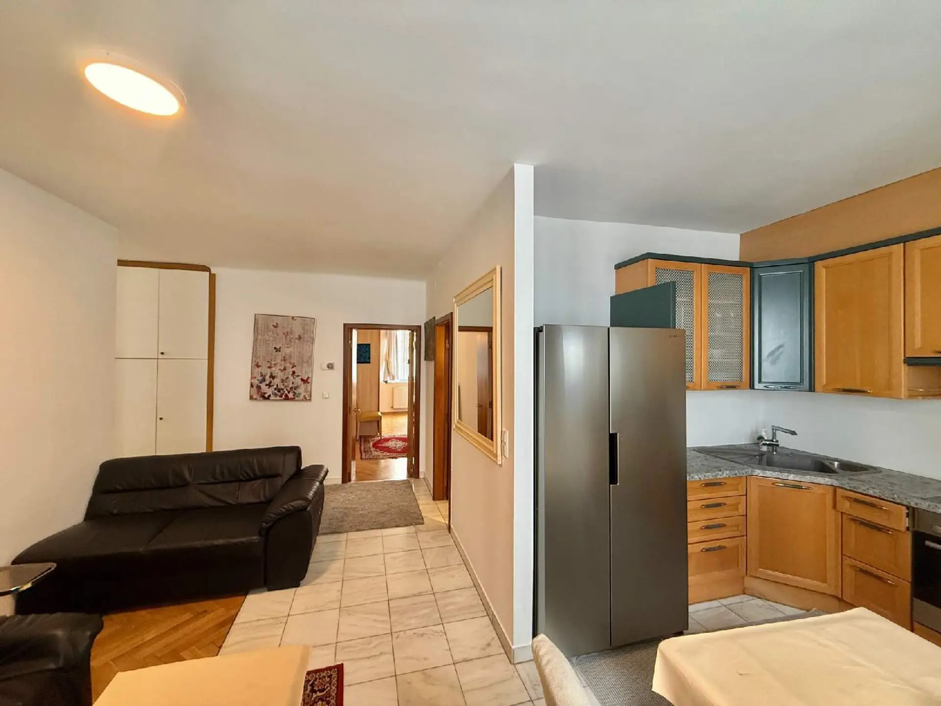 Edle Marmorböden, stilvolle Fischgrätparkette und ein elegantes Badezimmer aus Marmor verleihen der Wohnung eine zeitlose, fast schon luxuriöse Ausstrahlung. Ein kleiner, ruhiger Raucherbalkon zum Innenhof bietet einen geschützten Platz zum Rauchen.