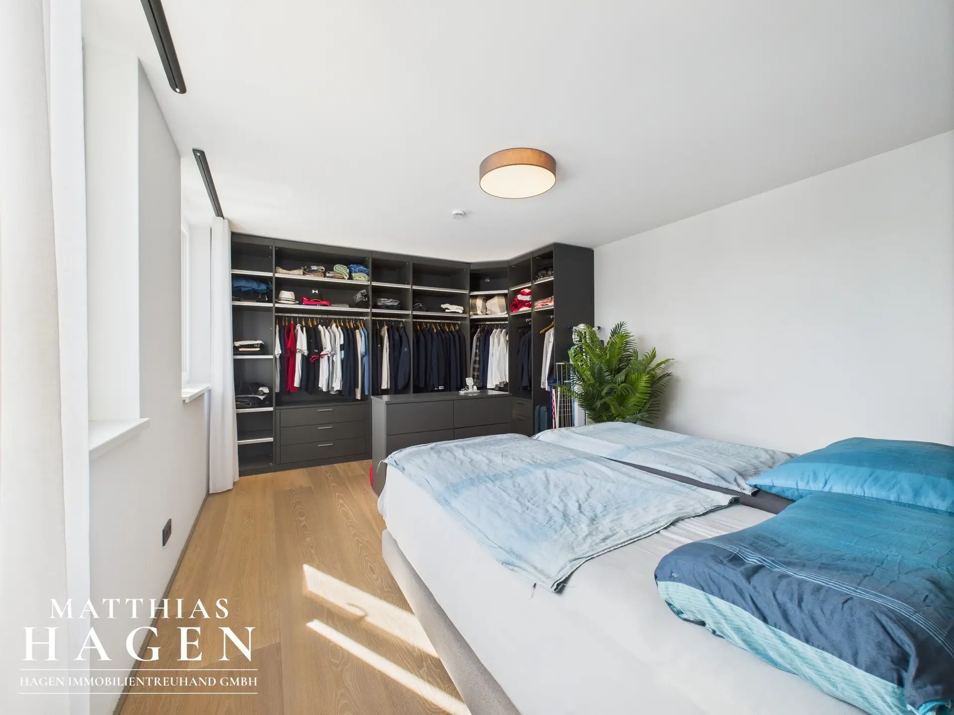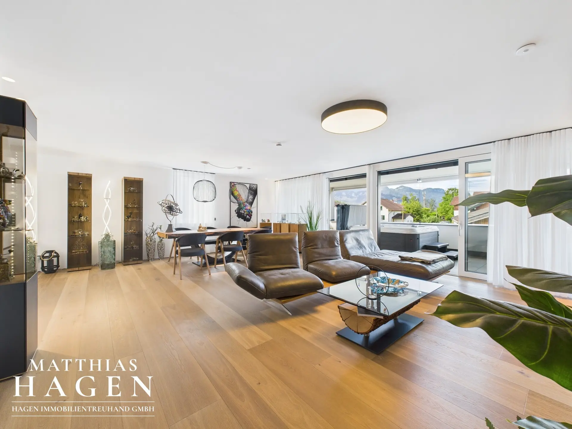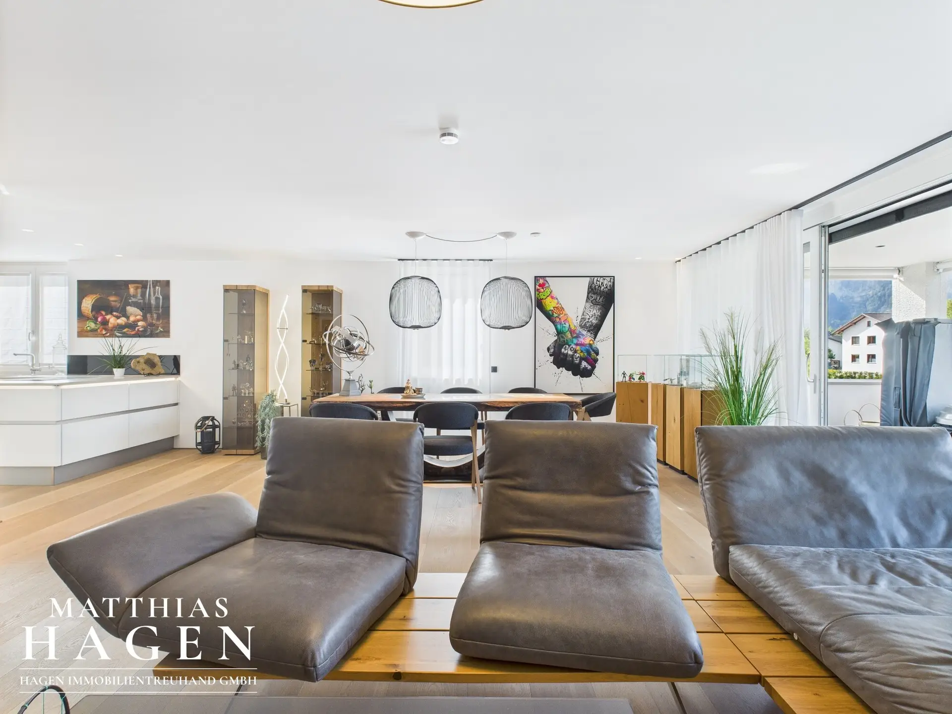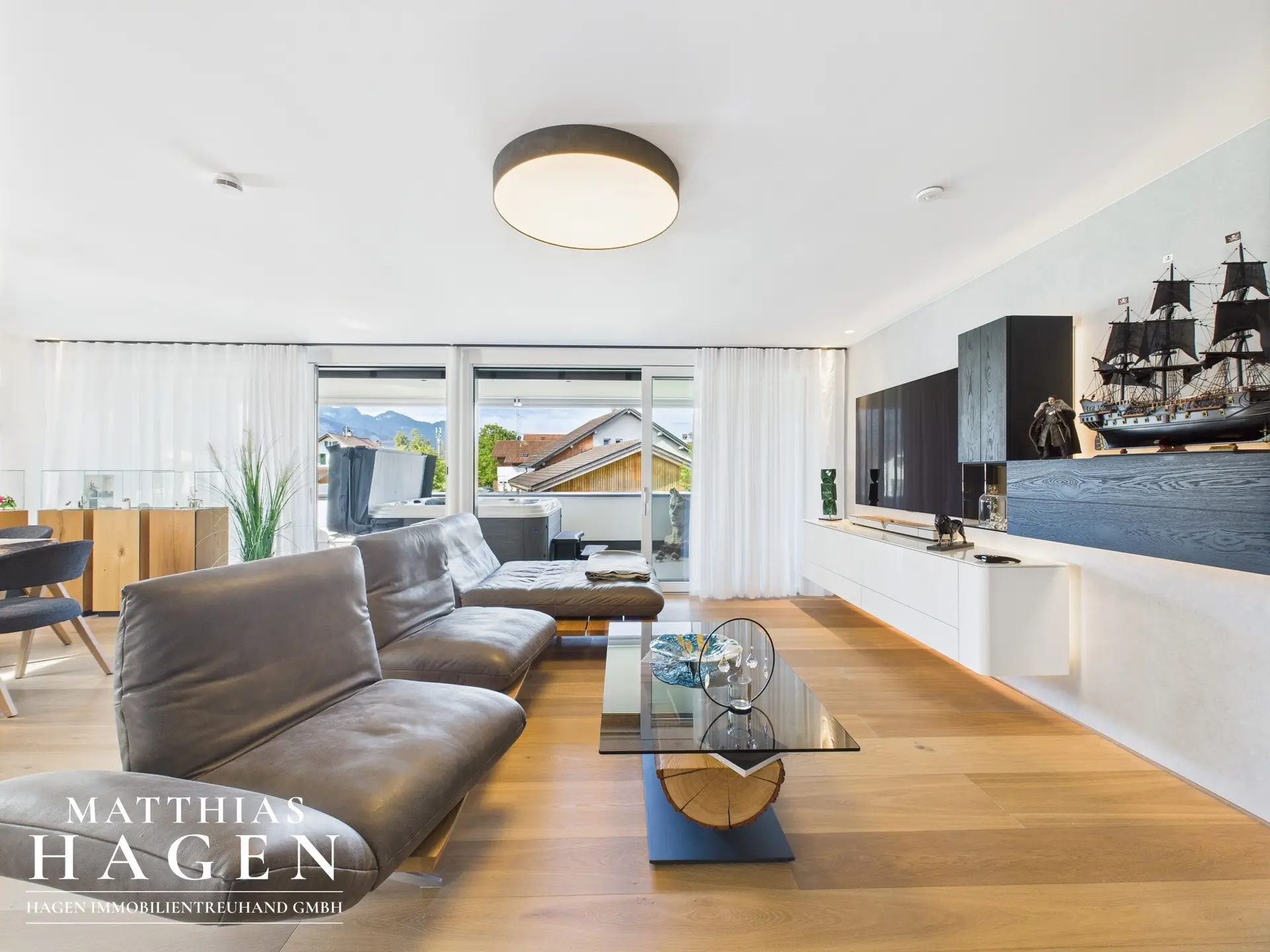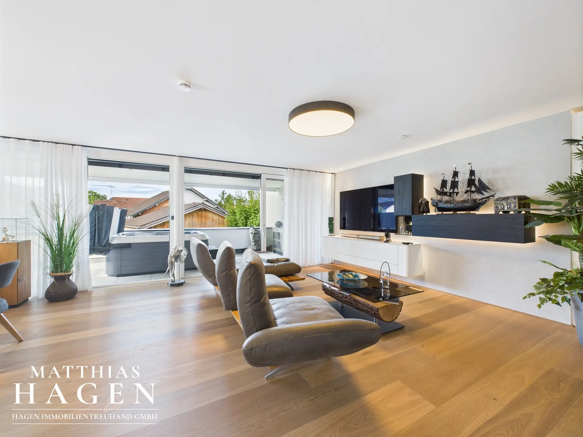 Die offen gestaltete Wohnfläche überzeugt mit einem durchdachten Grundriss und edler Ausstattung. Hochwertige Materialien, ein modernes BUS-System für smarte Steuerung von Licht, Heizung und Beschattung.