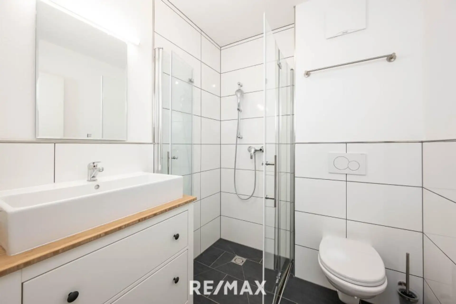 Die Wohnung überzeugt zudem durch hochwertige Materialien, stilvolle Badezimmer sowie elegante Holzböden, die für ein warmes Wohngefühl sorgen.
