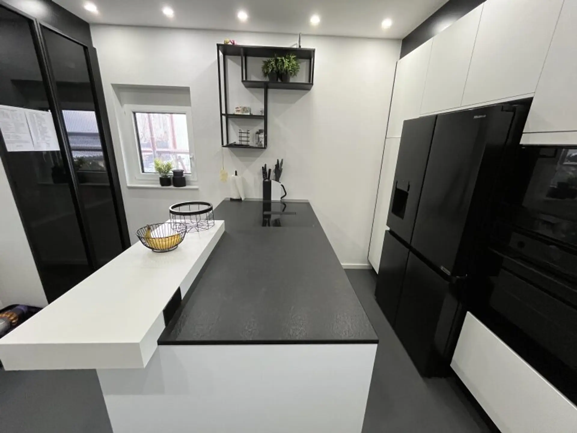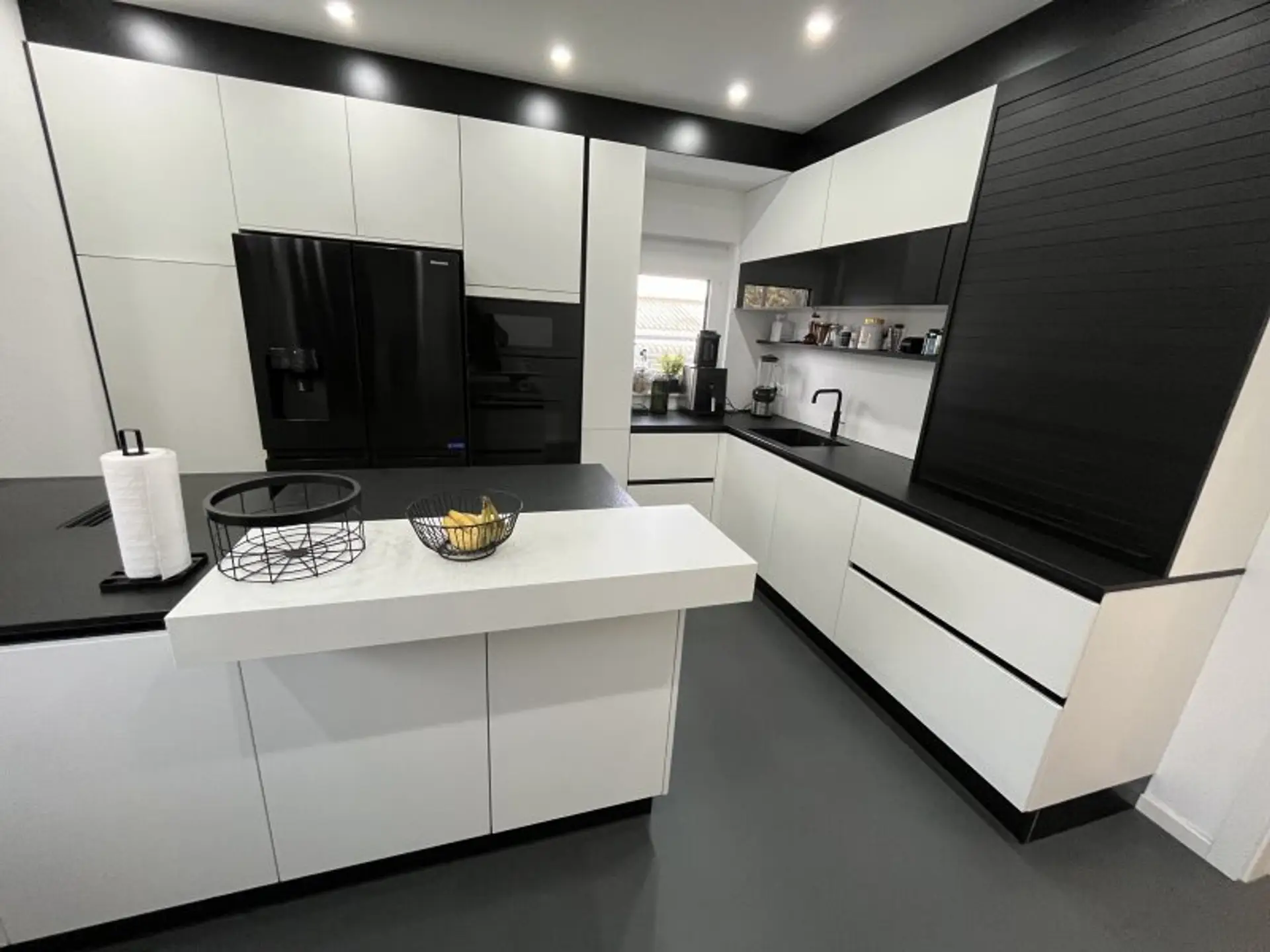 * Design-Küche modern in Weiß/Schwarz mit hochwertigen Geräten
