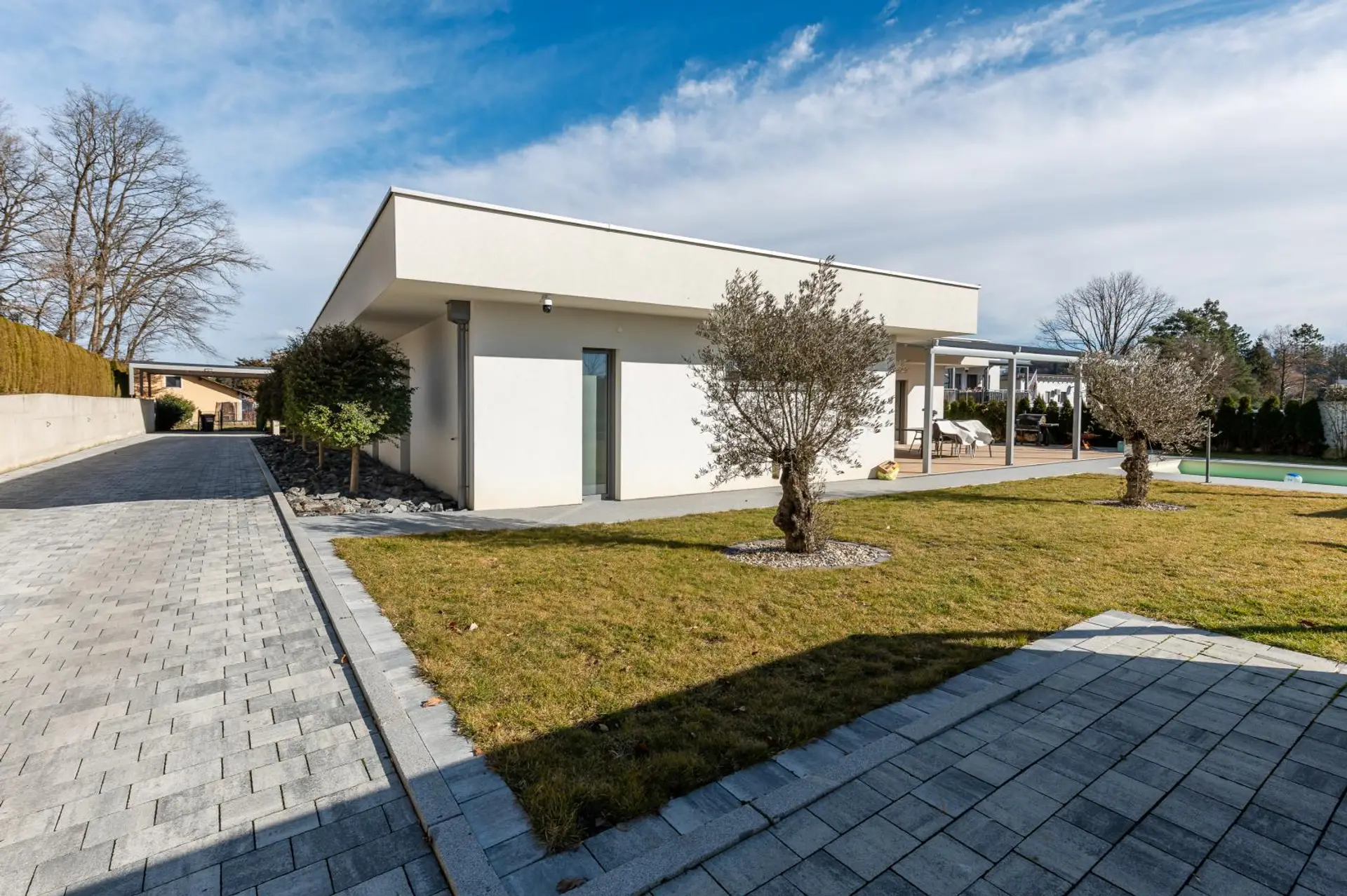 Abgerundet wird das Angebot durch eine Doppelgarage mit direktem Hauszugang sowie fünf zusätzliche Carports, die ausreichend Platz für Fahrzeuge bieten – ideal auch für Gäste oder eine Mehrgenerationennutzung. Die Lage des Bungalows bietet nicht nur Ruhe und Privatsphäre, sondern auch eine ausgezeichnete Anbindung an Infrastruktur wie Einkaufsmöglichkeiten, Schulen, öffentliche Verkehrsmittel sowie die Nähe zu städtischen Zentren wie Graz.
