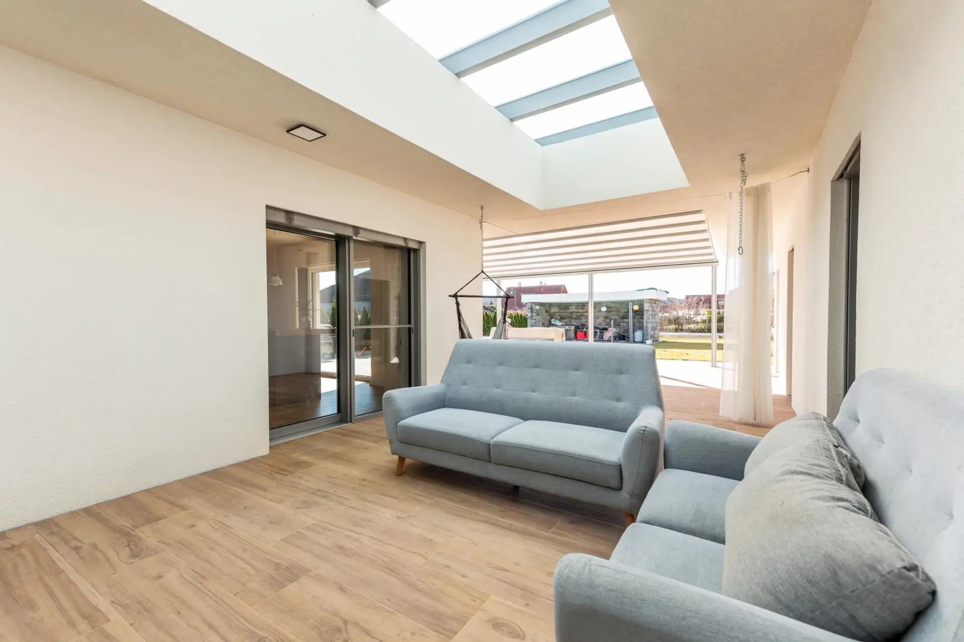 Der Bungalow befindet sich in neuwertigem Zustand und bietet durch seine durchdachte Planung und konsequent hochwertige Ausführung ein Zuhause mit unvergleichlichem Komfort. Fenster der Premium-Marke INTERNORM wurden flächenbündig eingebaut und harmonieren perfekt mit den ebenso flächenbündigen, eleganten Eichentüren von DAN, ausgestattet mit Soft-Close-Funktion. Zwei voll ausgestattete Designküchen der Marke DAN lassen auch kulinarisch keine Wünsche offen.