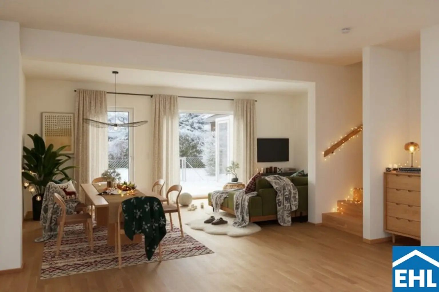 Ein offener, heller Wohn- und Essbereich mit direktem Ausgang auf die Terrasse. Der Garten schließt nahtlos an – ein privater Lieblingsplatz für Frühstück in der Sonne, Spielen im Grünen oder entspannte Abende draußen.