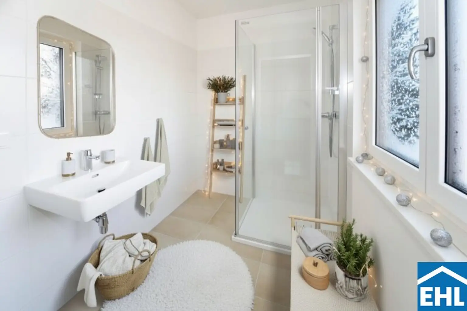 Drei angenehm ruhige Zimmer bieten flexible Nutzungsmöglichkeiten – Schlafräume, Kinderzimmer, Arbeitszimmer oder Gästezimmer. Zwei moderne Bäder ergänzen den durchdachten Grundriss und sorgen für Komfort im Alltag.