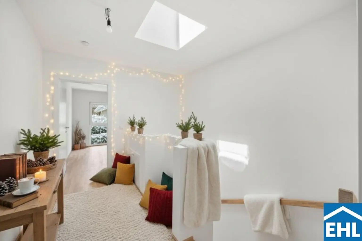 Großzügige Eigengärten, Terrassen und ein Vorgarten schaffen Raum zum Durchatmen. Durch die Südost-Ausrichtung sind die Räume lichtdurchflutet, große Fensterflächen bringen Offenheit und Wärme ins Haus.