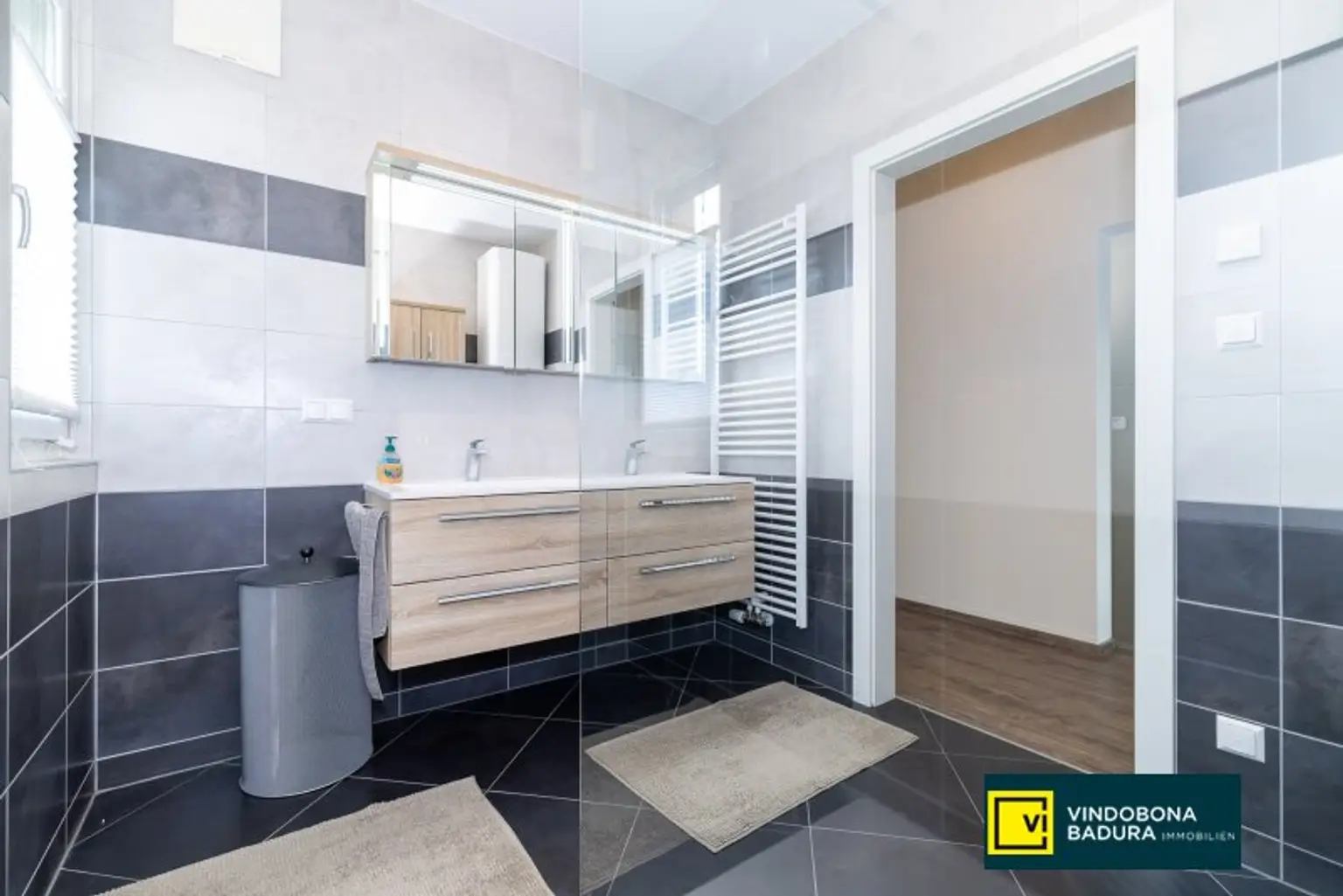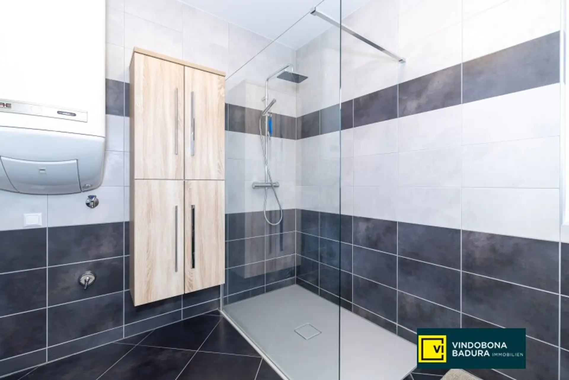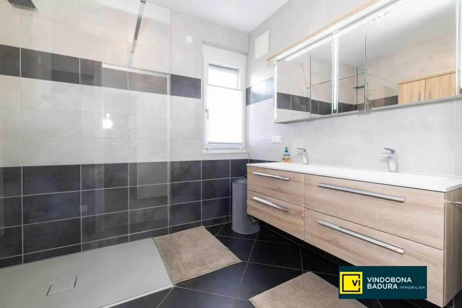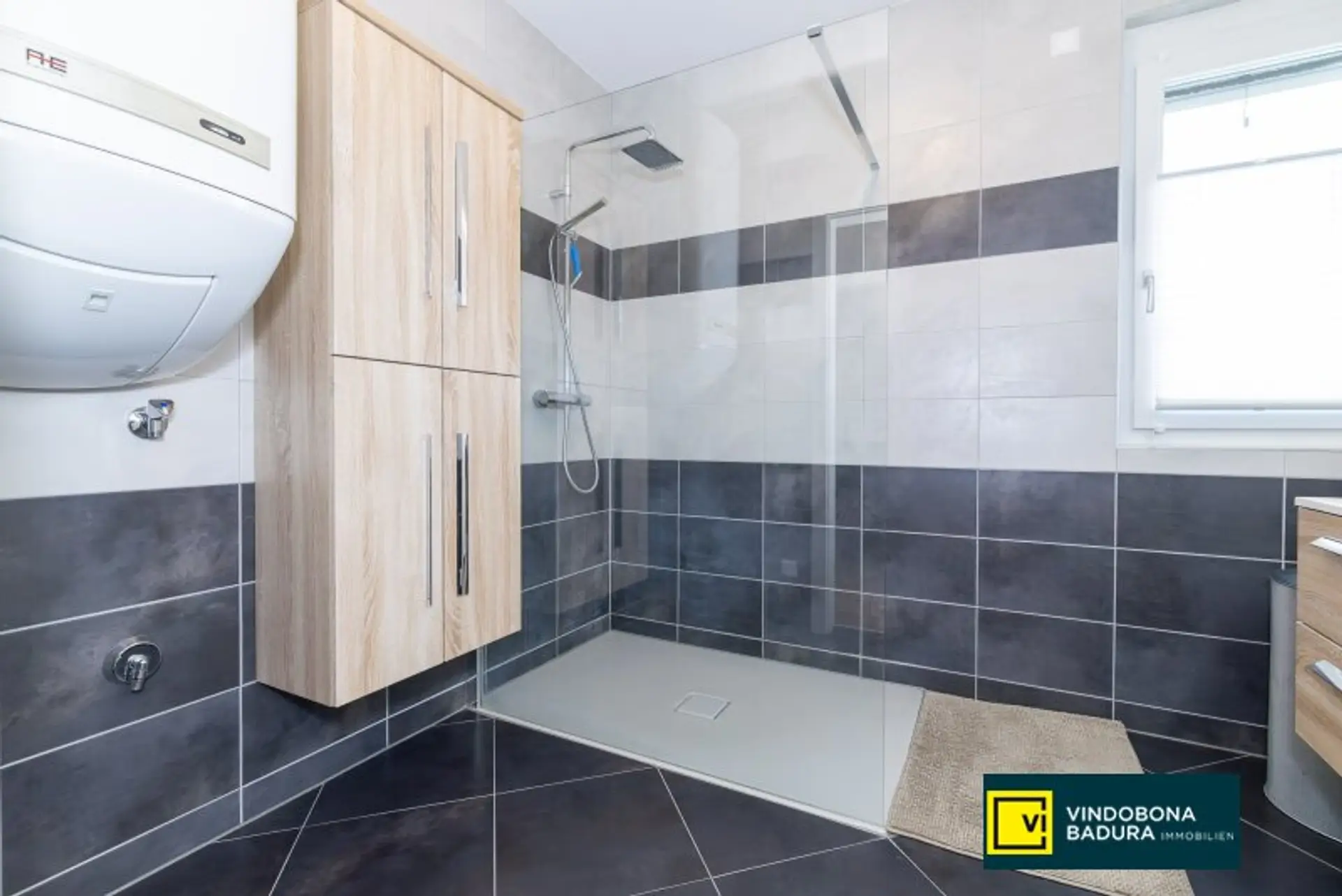 * Badezimmer mit Fenster und geräumiger Dusche