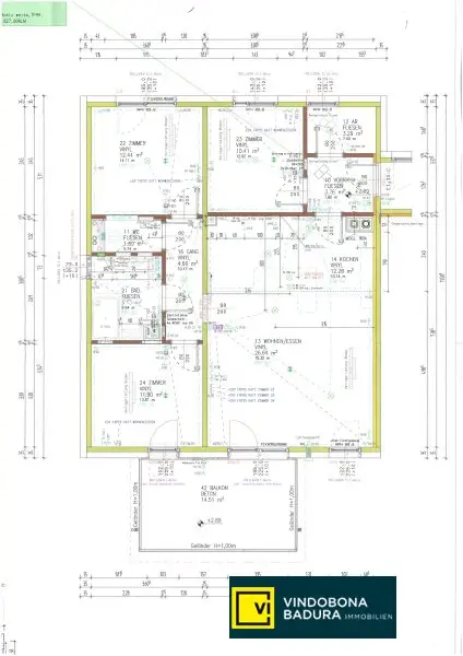 Vorraum (3,76m²), WC (1,89m²), Abstellraum (3,29m²), Zimmer 1 (10,41m²), Zimmer 2 (12,44m²), Zimmer 3 (11,90m²), Gang (4,66m²), Wohnbereich + Küche (26,64m² + 12,28m²), Bad (9,94m²), Balkon (14,51m²);