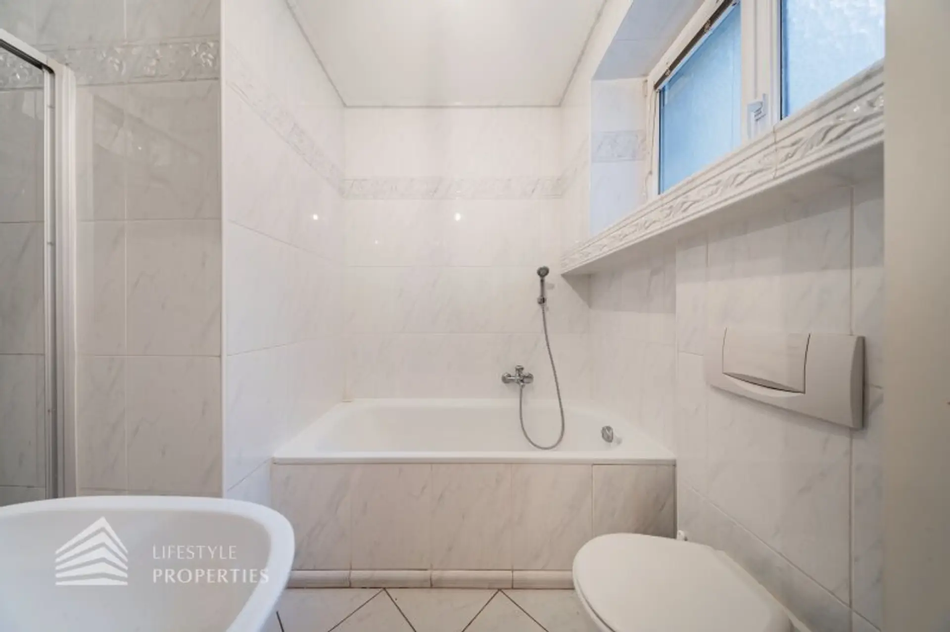 Tageslicht-Badezimmer mit Wanne, Dusche und WC