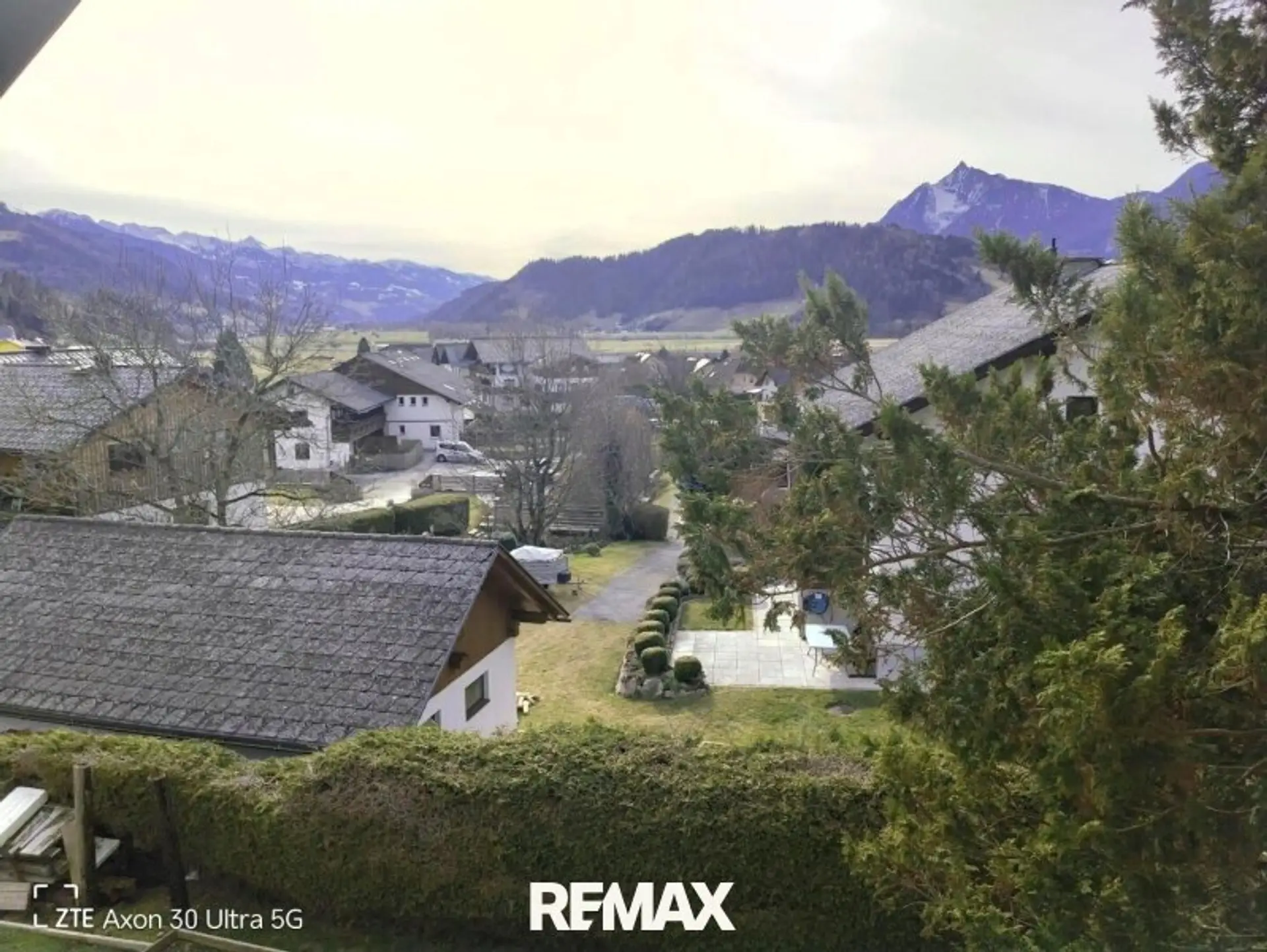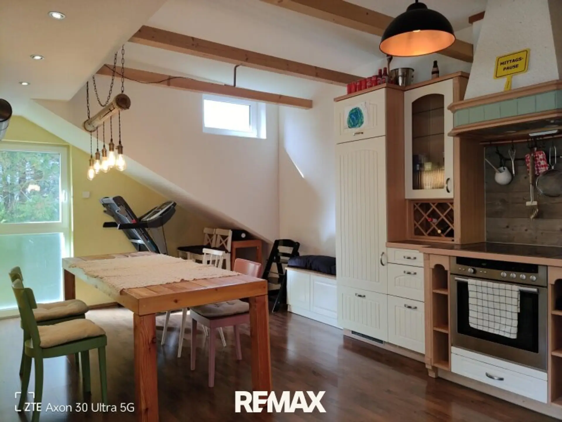 Großzügiger Wohn- und Essbereich mit integrierter Küche, Kaminofen und Zugang zum sonnigen Westbalkon