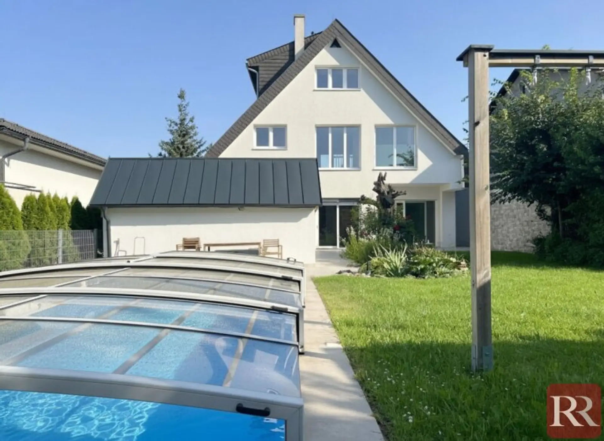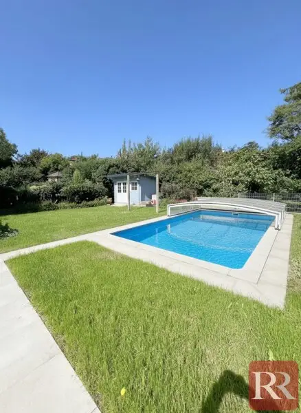 Der Eigengrund hat eine Fläche von 526m² (lt. Grundbuch) und ist mit einem Einfamilienhaus (ursprünglich Baujahr ca. 1980) über drei Ebenen mit kleinem Teilkeller, zwei Gartenhäusern und einem Pool bebaut. Trotz dieser Bebauung bleibt Platz für einen schönen, ebenen Garten.