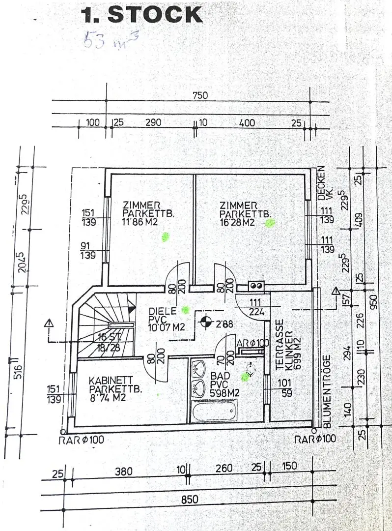 Die Wohnfläche von ca. 113 m² (inkl. ca. 7 m² Loggia) erstreckt sich über Erd- und Obergeschoss. Der Keller mit ca. 53 m² bietet zusätzlich großzügigen Stauraum sowie eine Sauna.