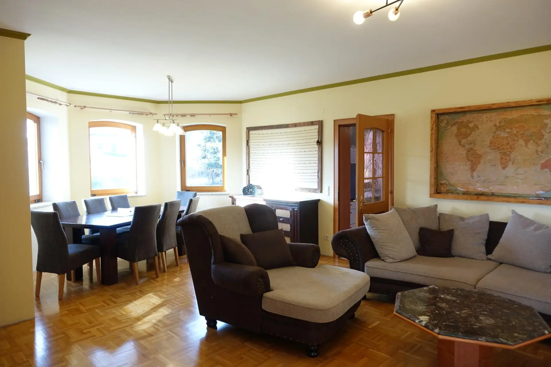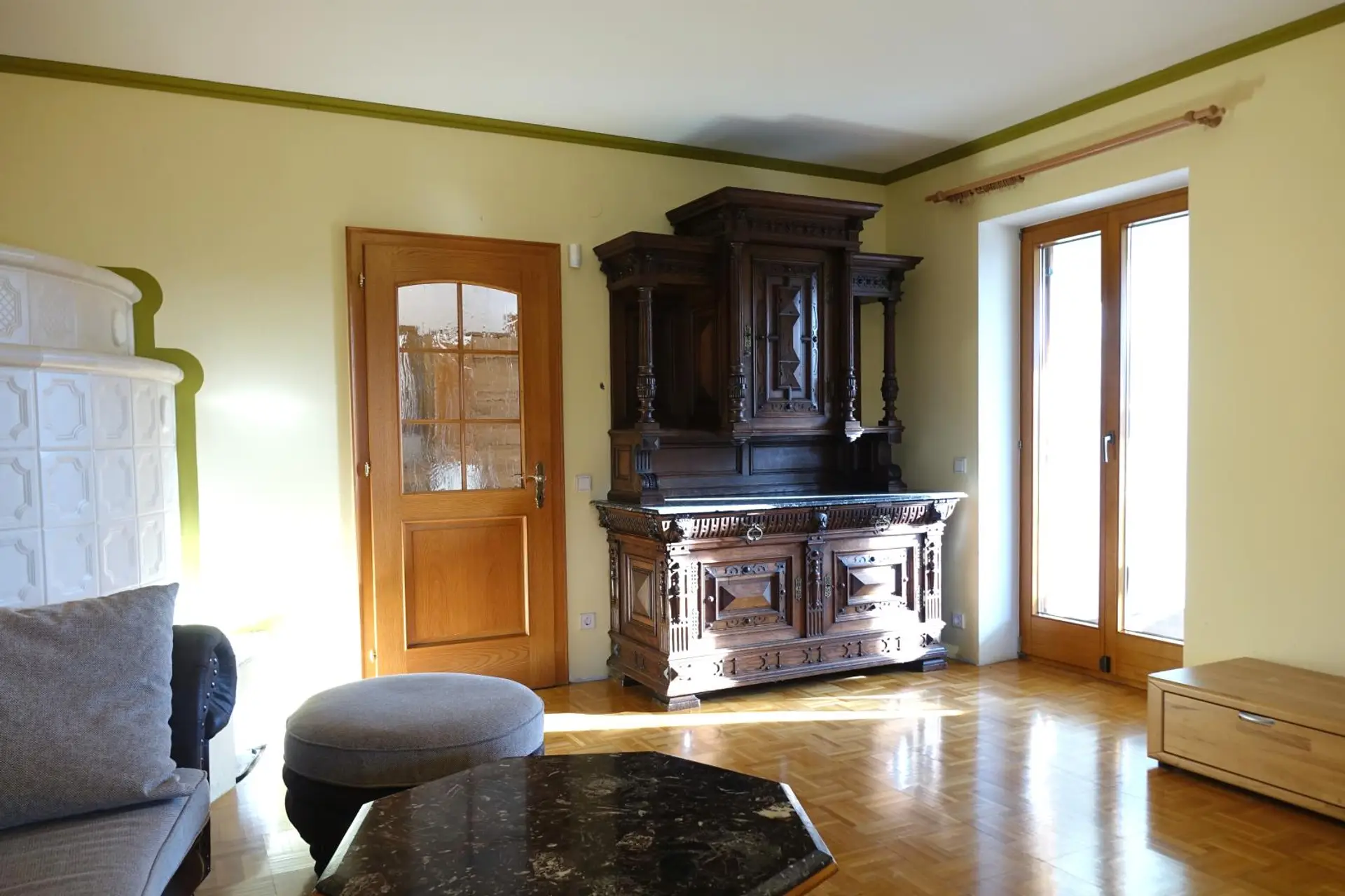 großer Wohn- und Essbereich mit gemütlichem Kachelofen und Zugang zur Terrasse, Küche mit angrenzender Speis, Badezimmer mit Eckbadewanne und Dusche, getrenntes WC und gesamt 3 weitere Zimmer – als Schlafzimmer, Kinderzimmer oder Büro nutzbar. Hochwertige Materialien wie Natursteinboden im Eingangs- und Stiegenbereich sowie Parkett in den Wohn- und Schlafräumen sorgen für eine angenehme Atmosphäre.