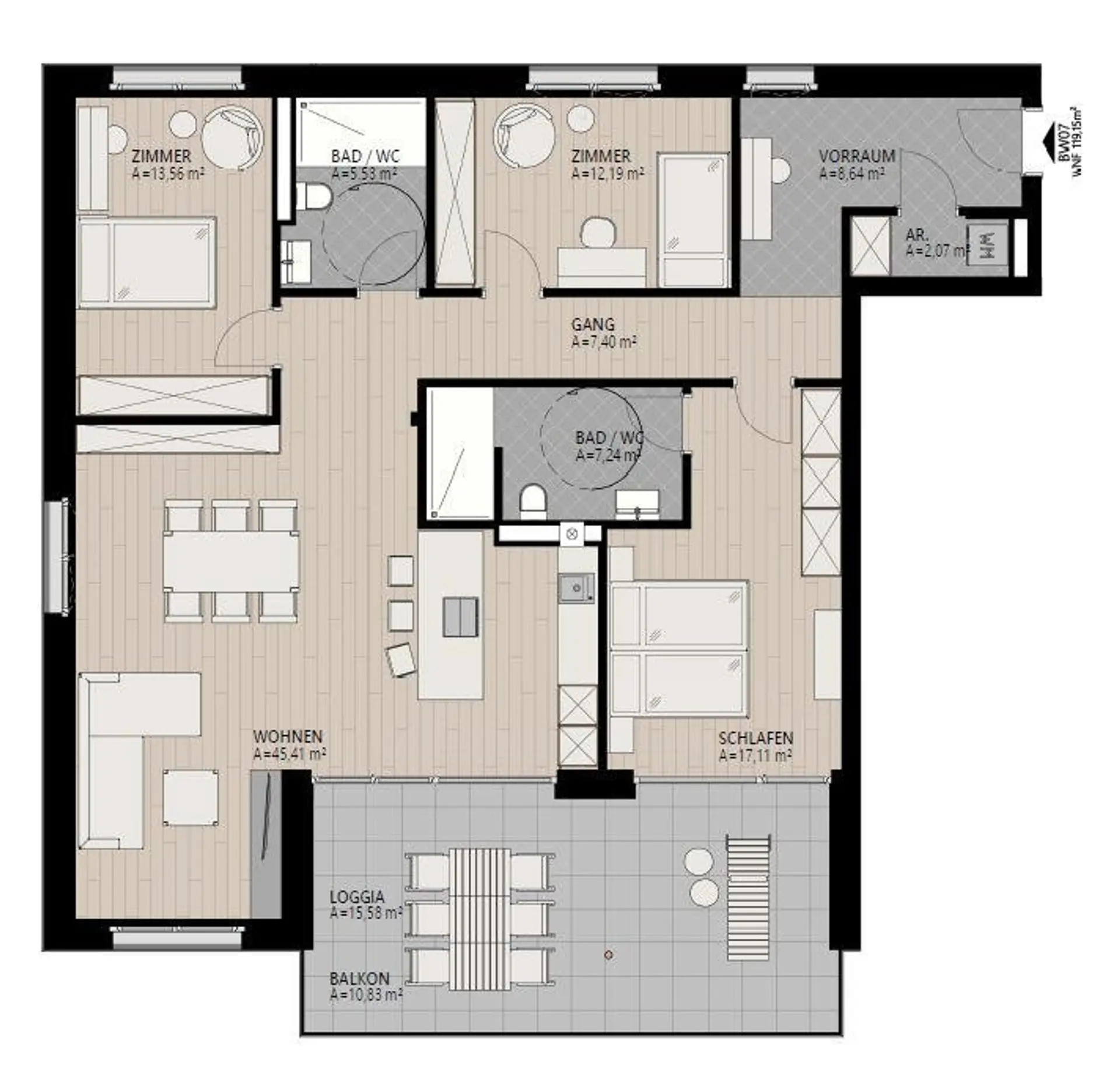 Die moderne Wohnanlage besteht aus 5 Häusern zu jeweils 8 Wohnungen mit Größen von 59m² bis 119m².
