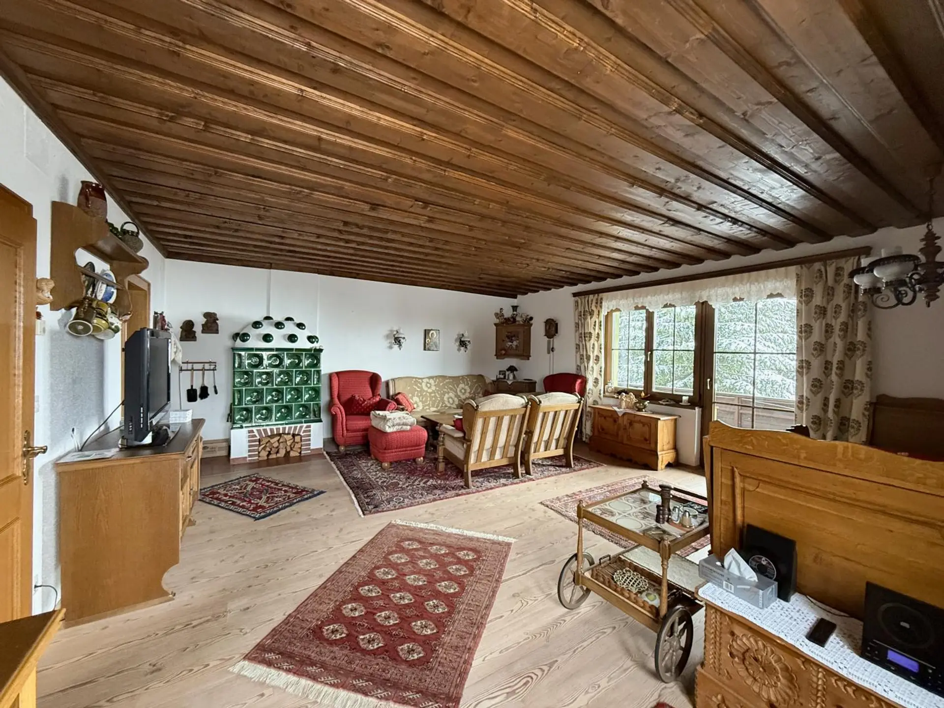 Beim Betreten gelangt man vom Eingangsbereich in die große, gemütliche Bauernstube mit Kamin, die sofort ein warmes und einladendes Wohngefühl vermittelt. Direkt angrenzend befindet sich die Küche. Ein WC mit Waschbecken komplettiert diese Ebene.