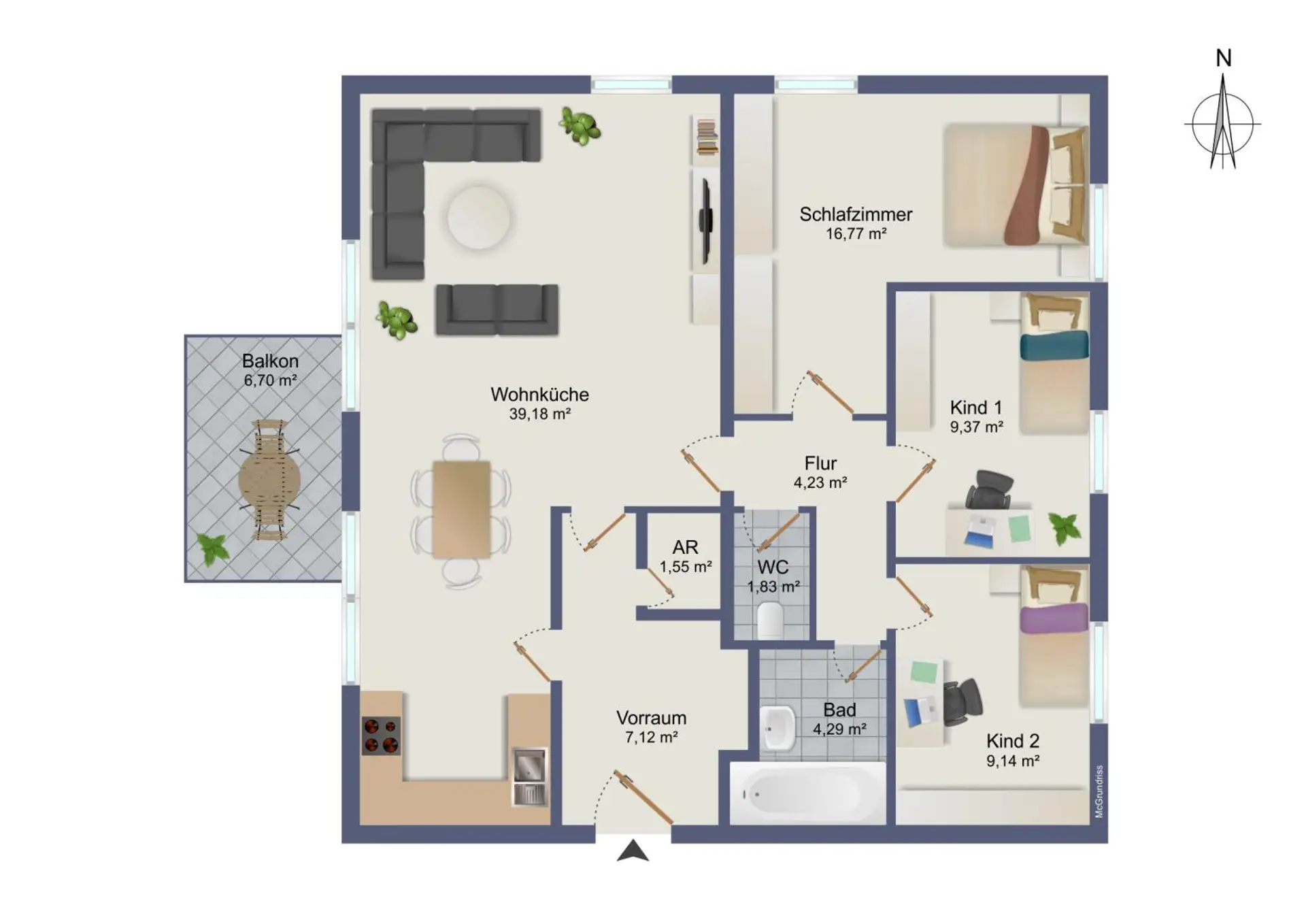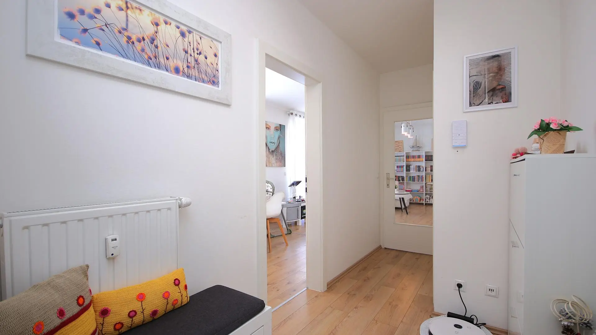 Durch den modernen Grundriss ist jedes Zimmer extra begehbar und schafft so idealen Freiraum für die ganze Familie. Vom großen und hellen Wohnzimmer gelangt man direkt auf den Balkon und kann so die Sonne bis in die Abendstunden genießen.