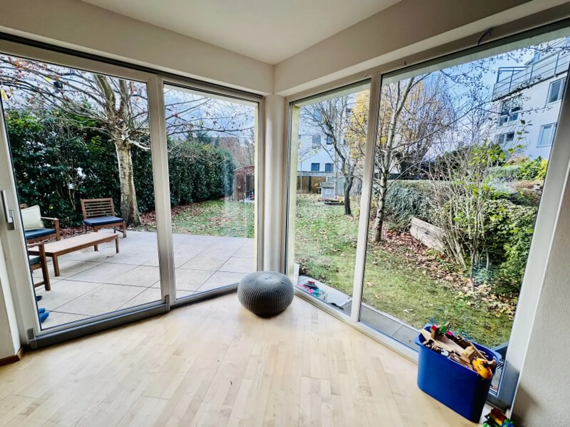 Der helle Wohn-/Essbereich mit Kamin, Echtholzparkett und offener Marken-Küche bildet das Herz des Hauses. Von hier gelangt man direkt auf die Terrasse und in den uneinsehbaren West-Garten, ausgestattet mit Teehaus, Spielflächen und viel Grün – ideal für Familien.