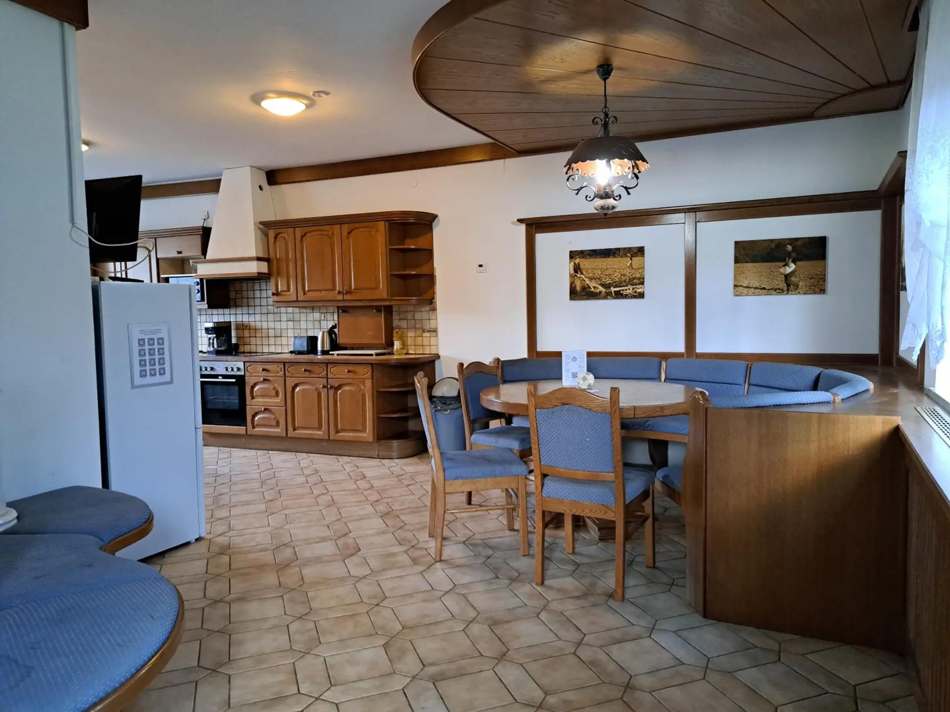 Im hinterem Eingangsbereich (über die Terrasse) im Erdgeschoss betreten wir das großzügiges Wohn-/Esszimmer mit großer rustikaler Küche, Kachelofen und runder Sitzgruppe. Im angrenzenden Stiegenhaus geht es abwärts in die Garage (und Heizraum) und aufwärts in die Schlafräume.