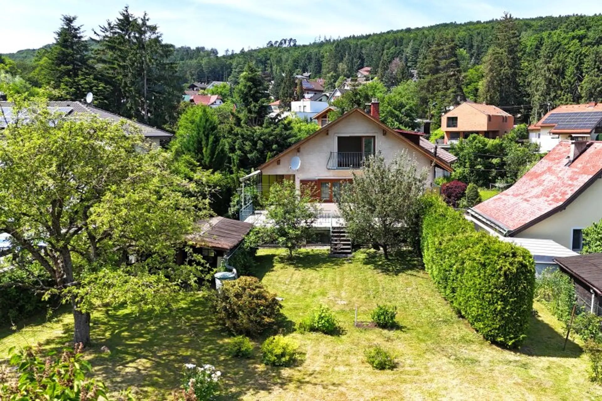 Dieses gepflegte Wohnhaus befindet sich in idyllischer Ruhelage im Ortsteil Hauersteig an den östlichen Ausläufern des Troppbergs und bietet auf beiden Seiten traumhafte Ausblicke auf die grünen Hügel des umgebenden Wienerwalds. Die Liegenschaft punktet durch ihre herrliche Grünruhelage und den entzückenden Garten mit verschiedenen Obstbäumen und Naschsträuchern, die jedes Kinderherz höher schlagen lassen.