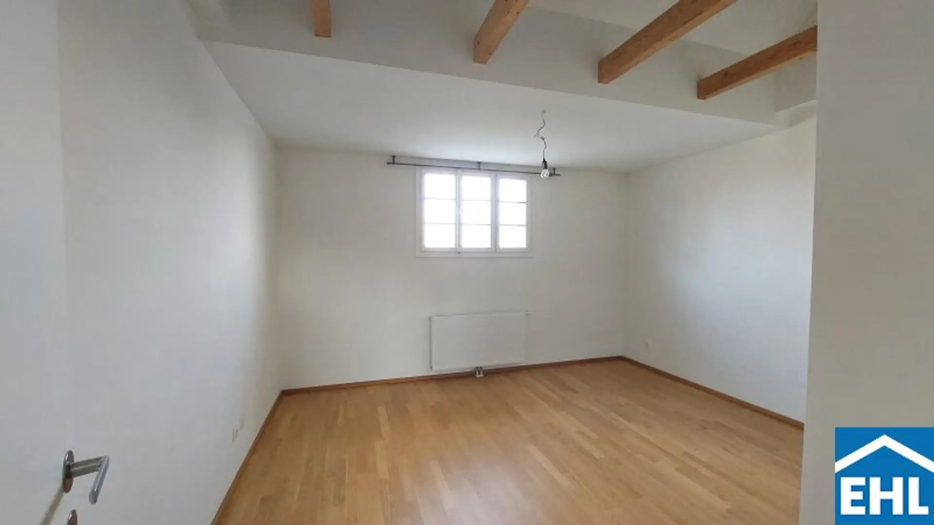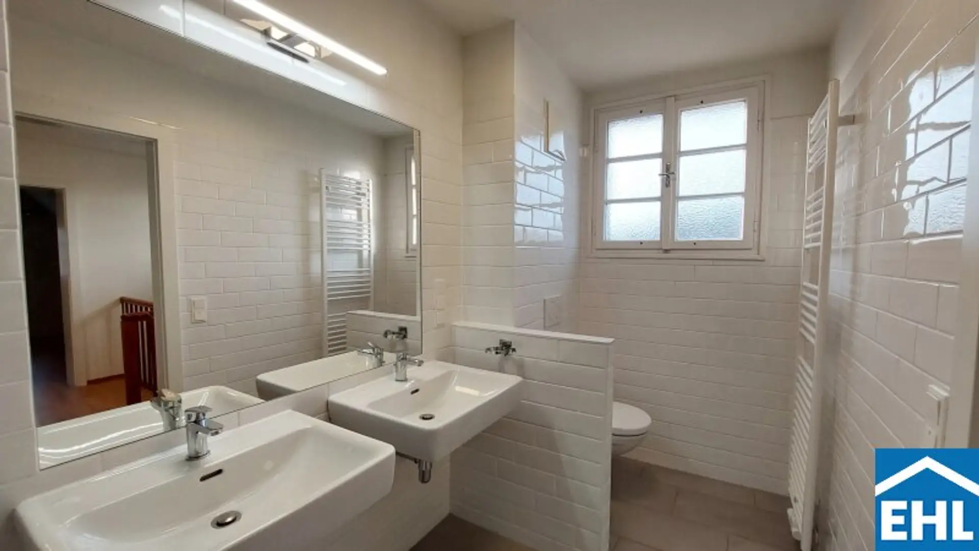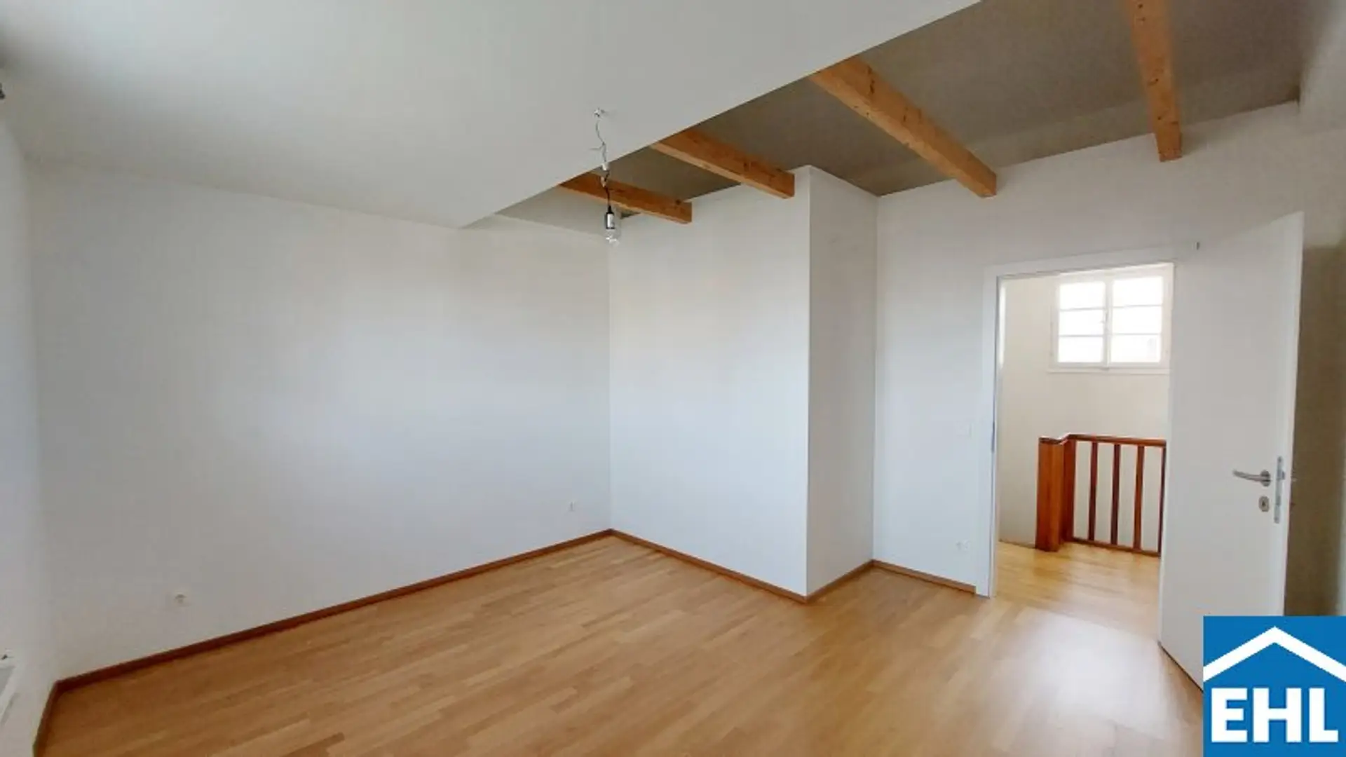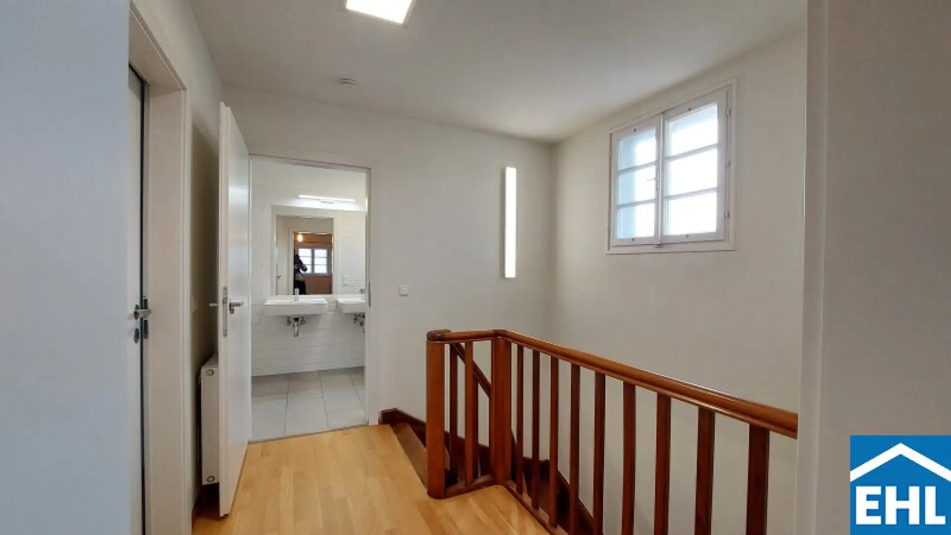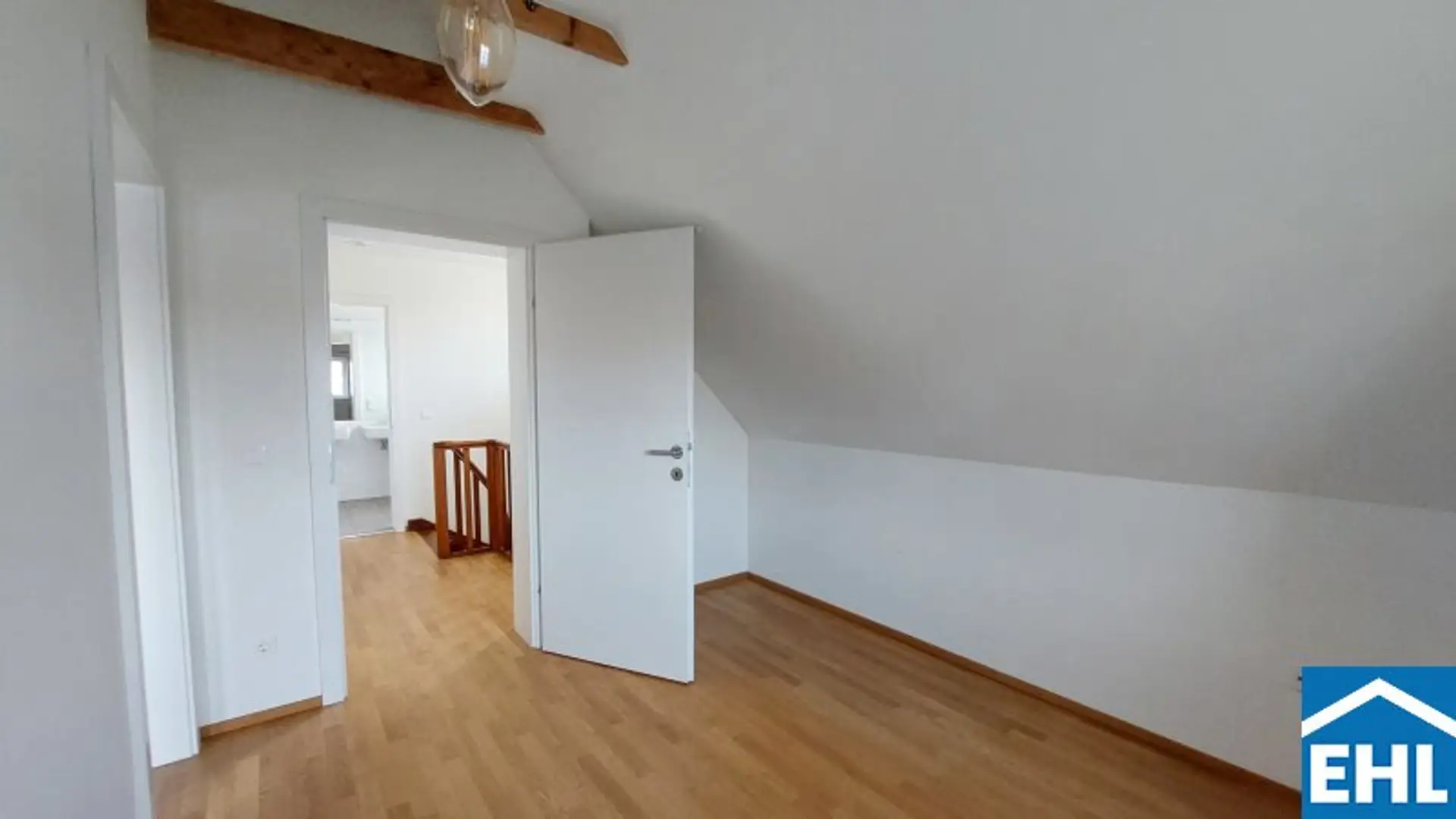 Im 1. Obergeschoß befinden sich drei Schlafzimmer (eines davon als Durchgangszimmer ausgeführt) mit charmanten Dachbalken, sowie ein Badezimmer mit Badewanne, Doppelwaschbecken und WC.