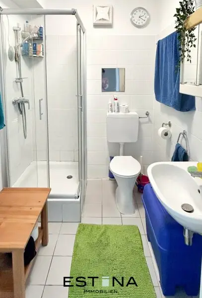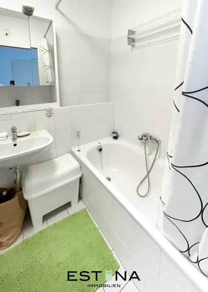 - Badezimmer mit Badewanne, Dusche, Doppelwaschbecken, Waschmaschinenanschluss