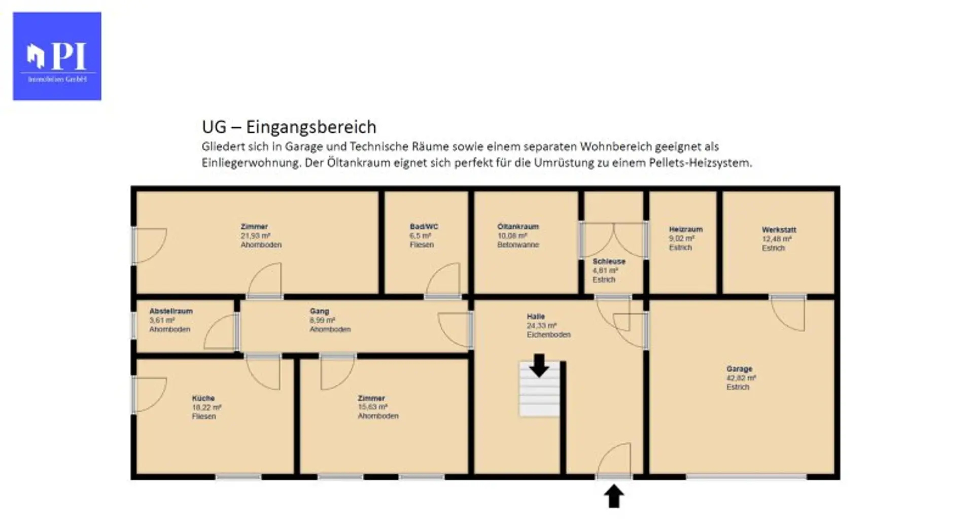 Besonderheit - das Untergeschoß teilt sich in zwei Bereiche - auf der rechten Seite befinden sich die Technikräume, Heizräume und die Garage. Auf der linken Seite findet man einen abgetrennten Wohnbereich. Dieser kann ohne Weiteres als Einliegerwohnung verwendet werden. Ein eigenes Bad und WC, sowie ein eigener Kochbereich und ein Schlafzimmer sind vorhanden. Perfekt als Wohnmöglichkeit für eine Hausbetreuung oder ein Kindermädchen.
