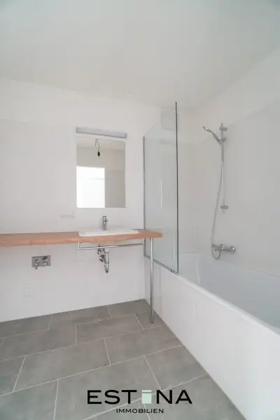 - geräumiges Badezimmer mit Waschbecken, Badewanne und Waschmaschinenanschluss