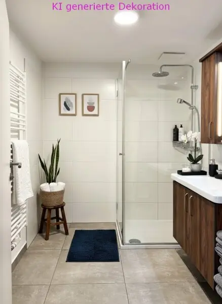 Das moderne Bad hat etwa 5,2 m2 Fläche und ist mit einer geräumigen Dusche mit großem Regenduschkopf und Brause sowie einer Glasduschwand ausgestattet. Außerdem sind bereits ein Spiegelschrank und ein Waschtisch mit viel Stauraum und Beleuchtung montiert. Der Anschluss für die Waschmaschine befindet sich ebenfalls hier und auch ein Handtuchheizkörper ist vorhanden.